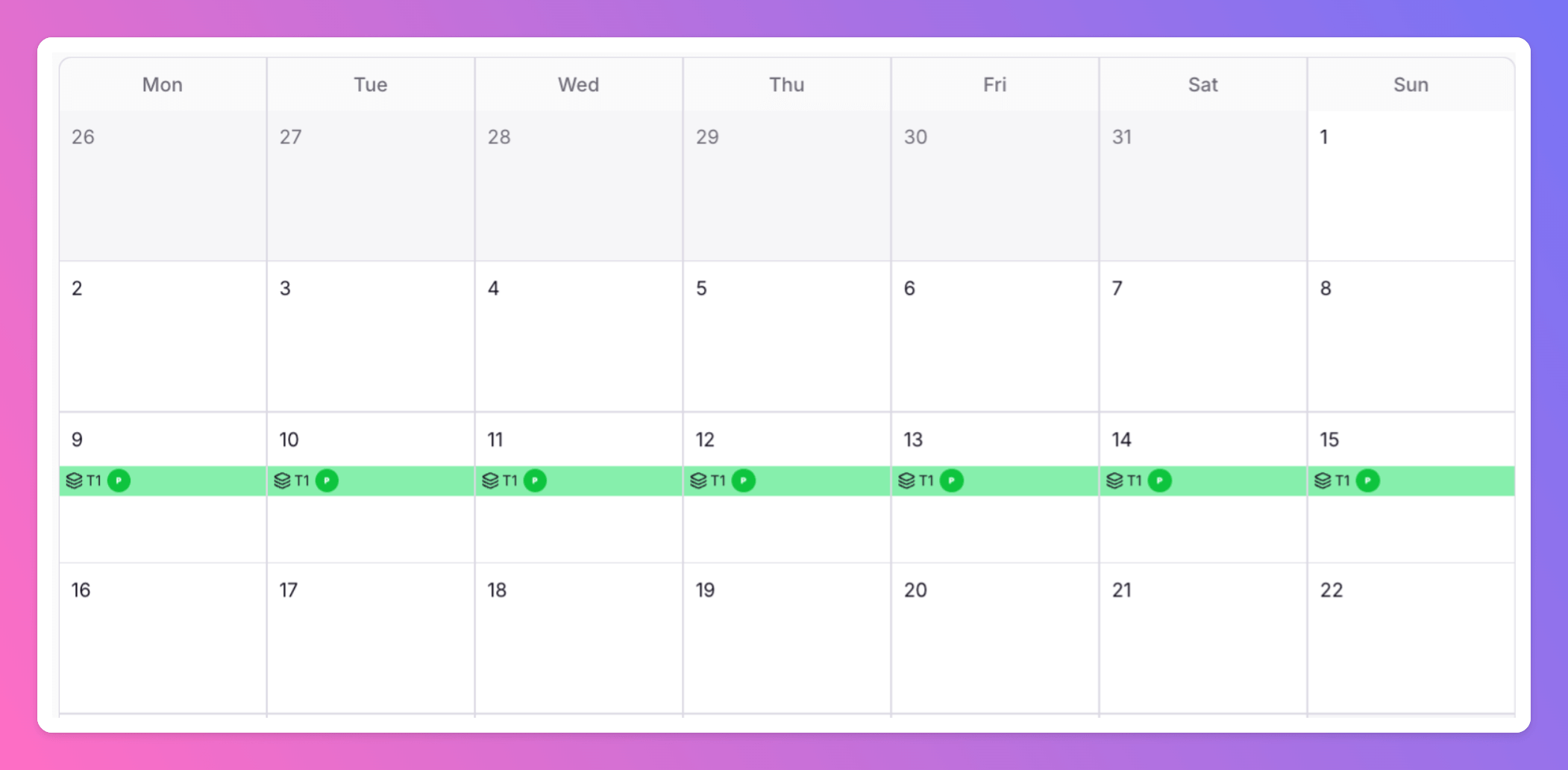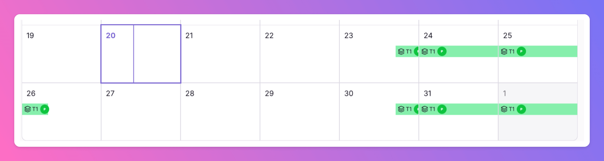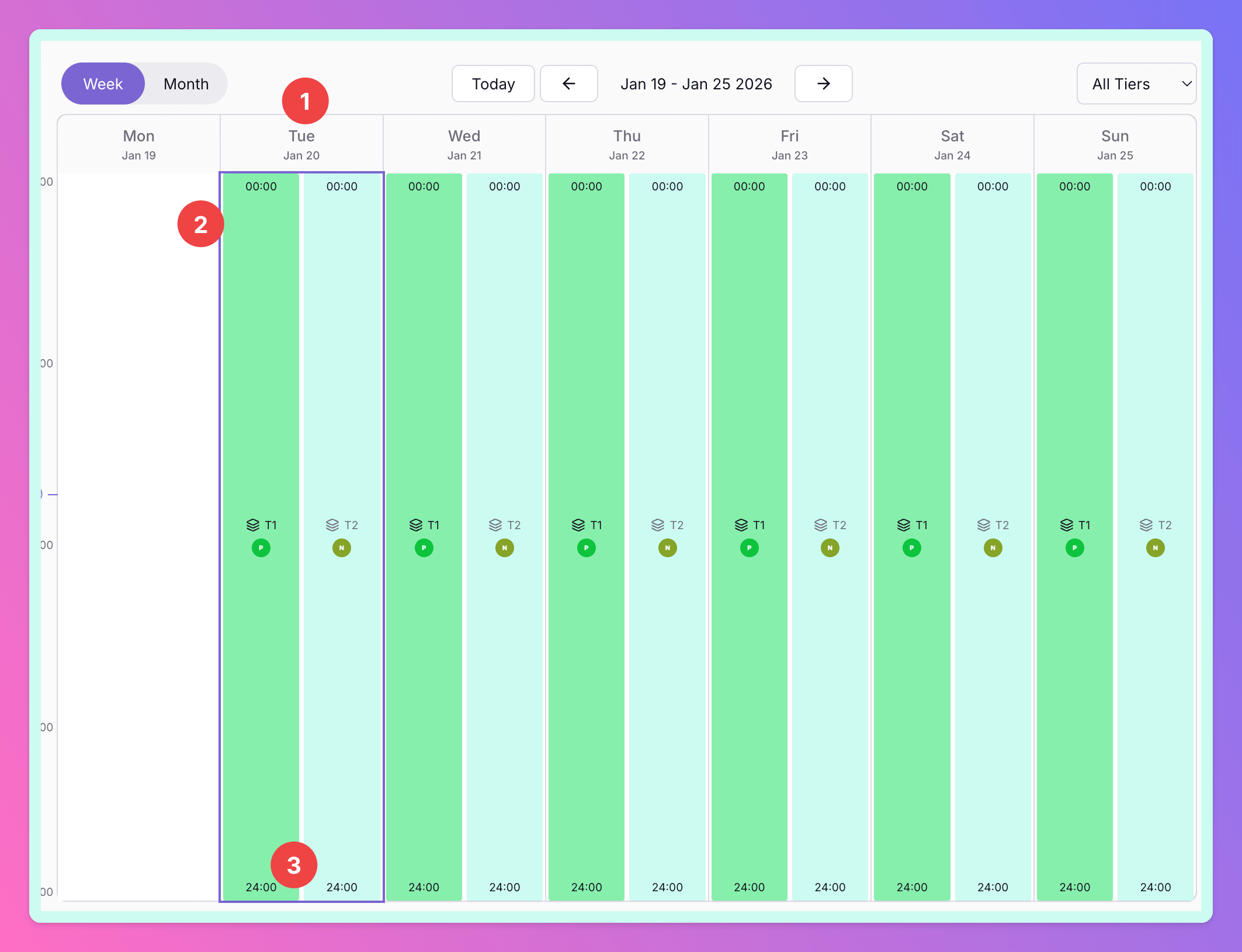 - Tier Labeling: Each schedule entry is labeled with a ‘T’ followed by a number to indicate the on-call tier. ‘T1’ corresponds to Tier 1, and ‘T2’ to Tier 2, providing a clear distinction of responsibility levels.