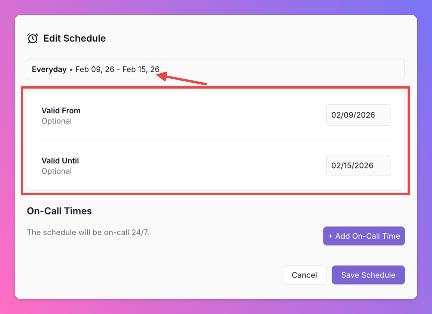 - After saving, you will immediately see the current schedule’s settings displayed in the top left corner. This provides a clear and easily understandable representation of the saved schedule settings, ensuring visibility and quick reference to the configured on-call periods and weekdays.