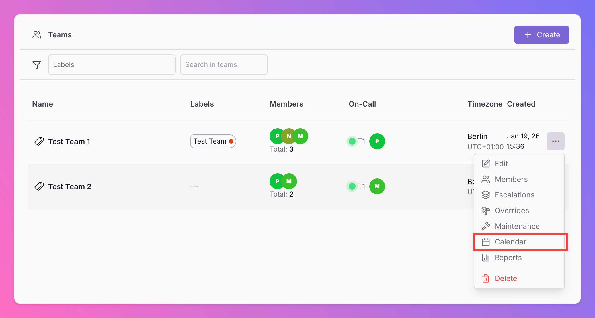 To view the calendar of a team and gain an overview of team members’ on-call and off-call periods within each escalation tier, follow this step:Access Team Calendar Page