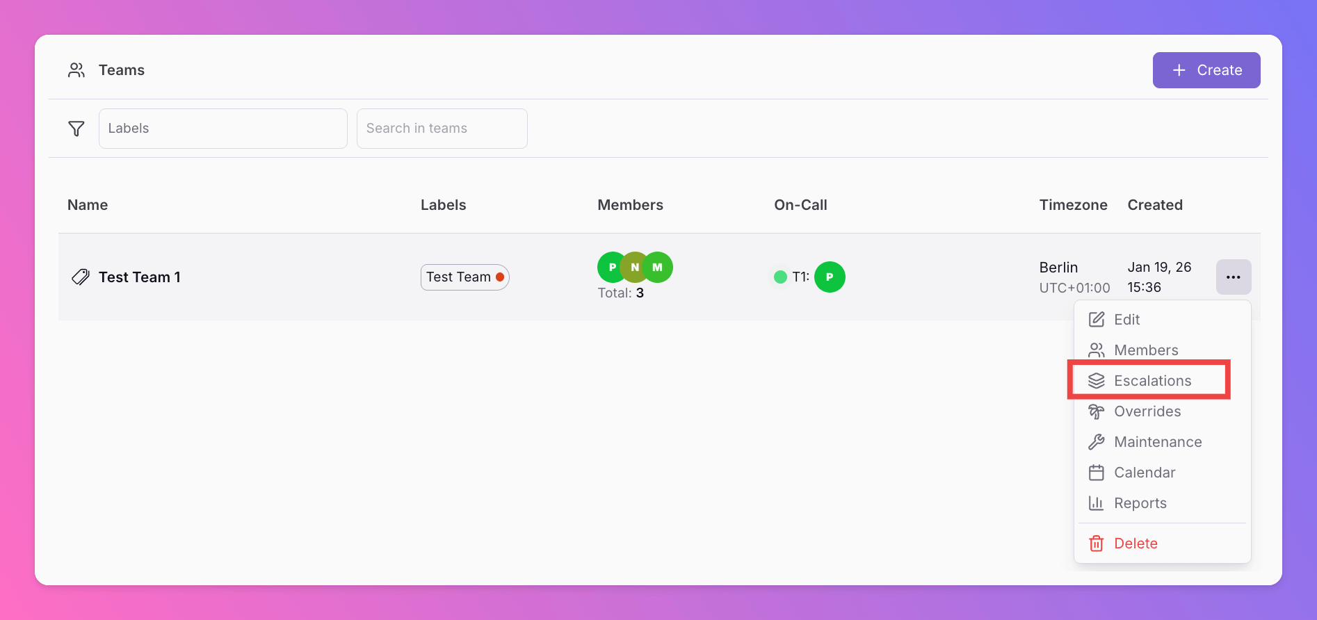 To access the escalation management page, simply select theEscalations option for the respective team.