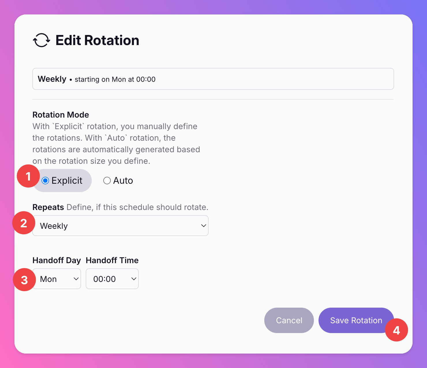 If your schedule includes an “Valid From” date, adding or removing rotations may affect which rotation is currently on-call. Be sure to review and adjust your changes to maintain the intended order. For explicit rotations, you can correct the rotation order per drag-and-drop. For auto-rotations, enter the