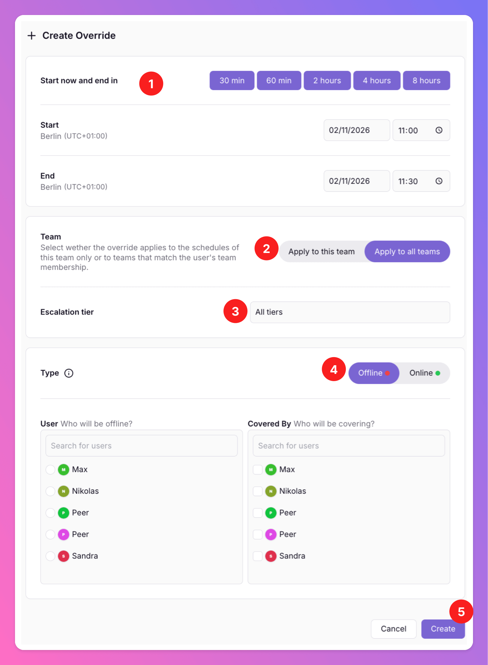 - Specify the type (“Offline” or “Online”), the user for whom you want to create the override, and - if the user will be “Offline” - optionally the covering user who will replace the offline user in his shift.