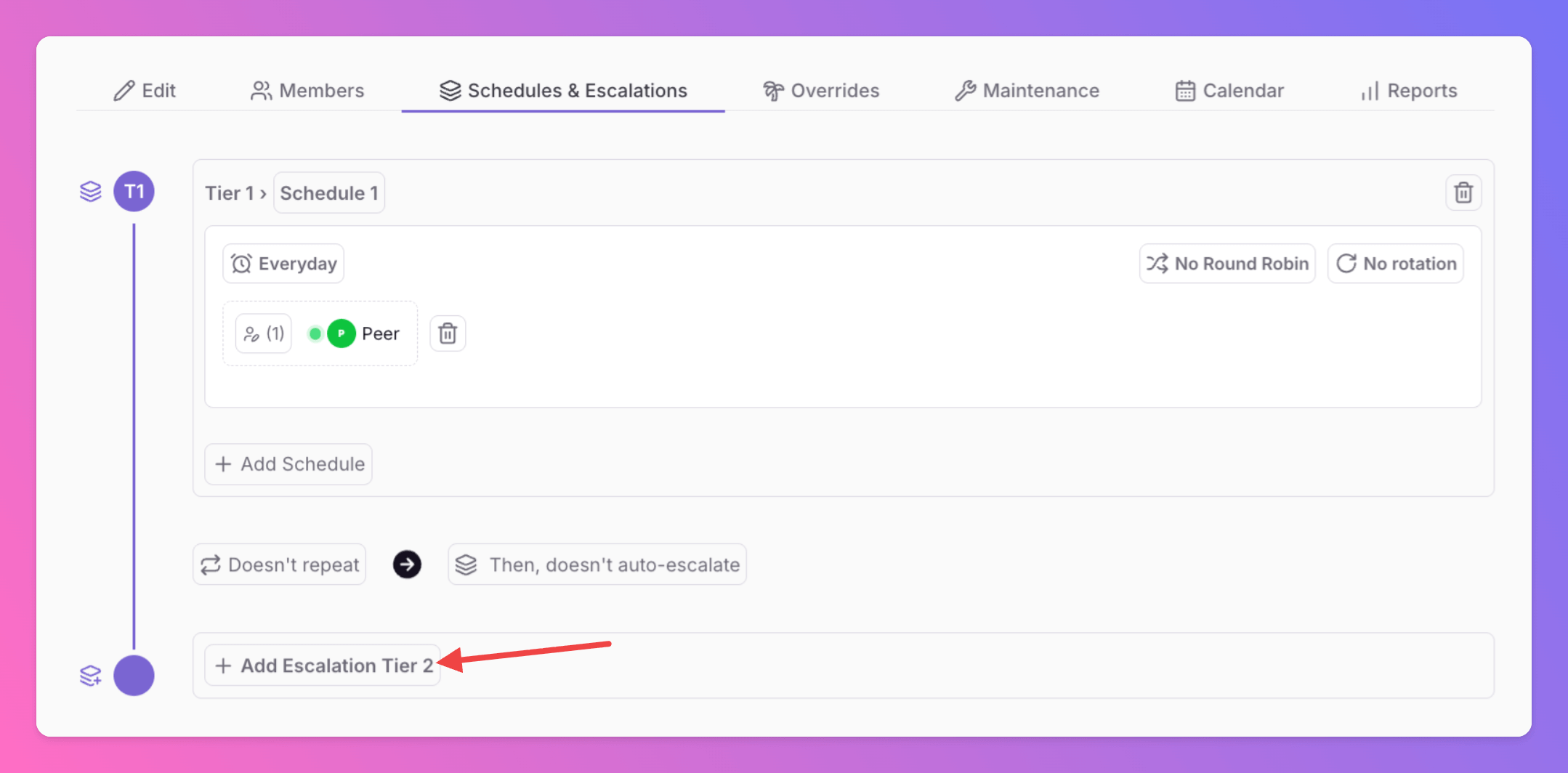 To enable auto-escalations, you first need to add at least a second escalation tier. Without it, the incident will remain within Tier 1, and no further escalation will occur. Click+ Add Escalation Tier and select team members to create the second tier.