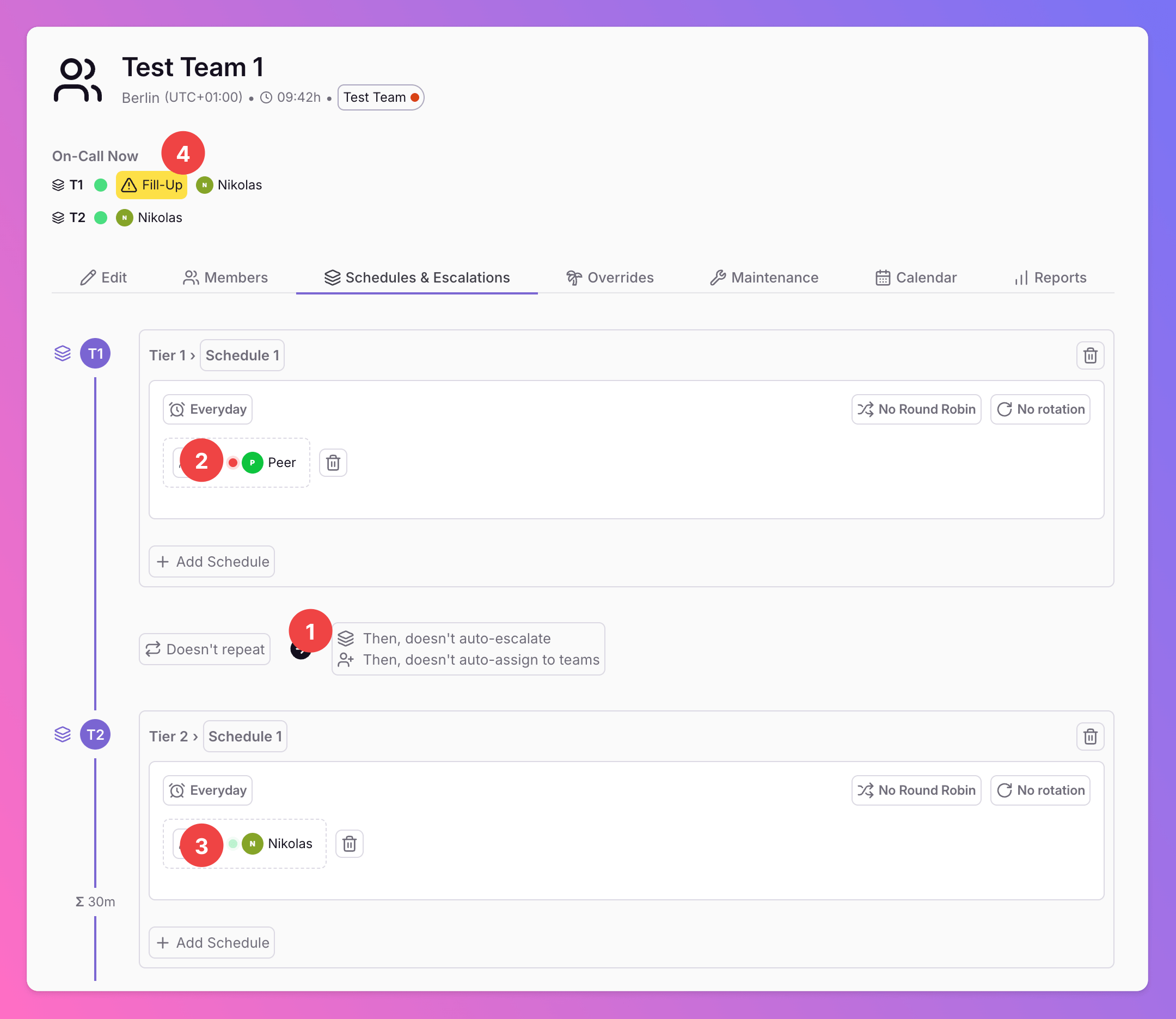 - This is where the auto fill-up feature comes into play. Nikolas (Tier 2) fills Peer’s (Tier 1) vacant spot during his absence. As a temporary Tier 1 member, he is the first to be automatically informed about any incidents. As soon as Peer is back on-call, he’ll resume his place in Tier 1.