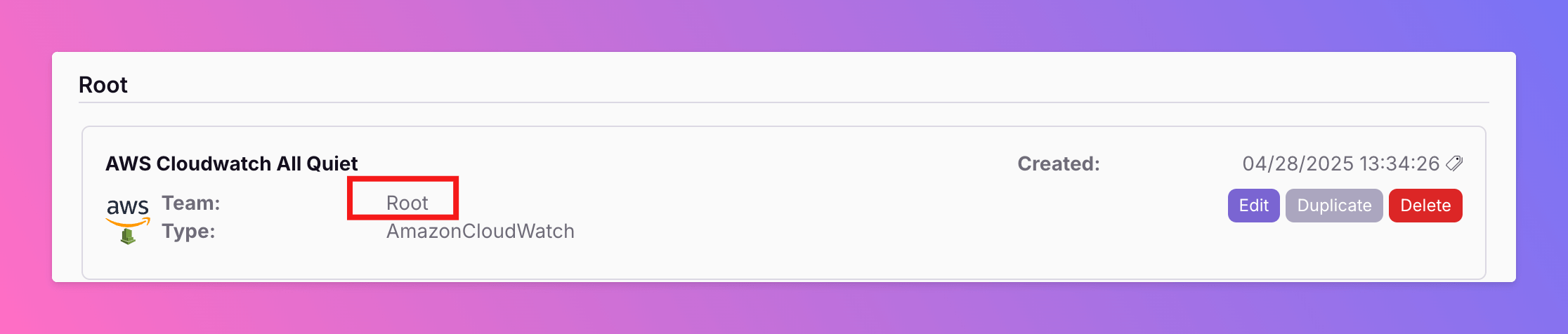 - Notice that the incident was created in the “Root” team, the team associated with the AWS CloudWatch integration.