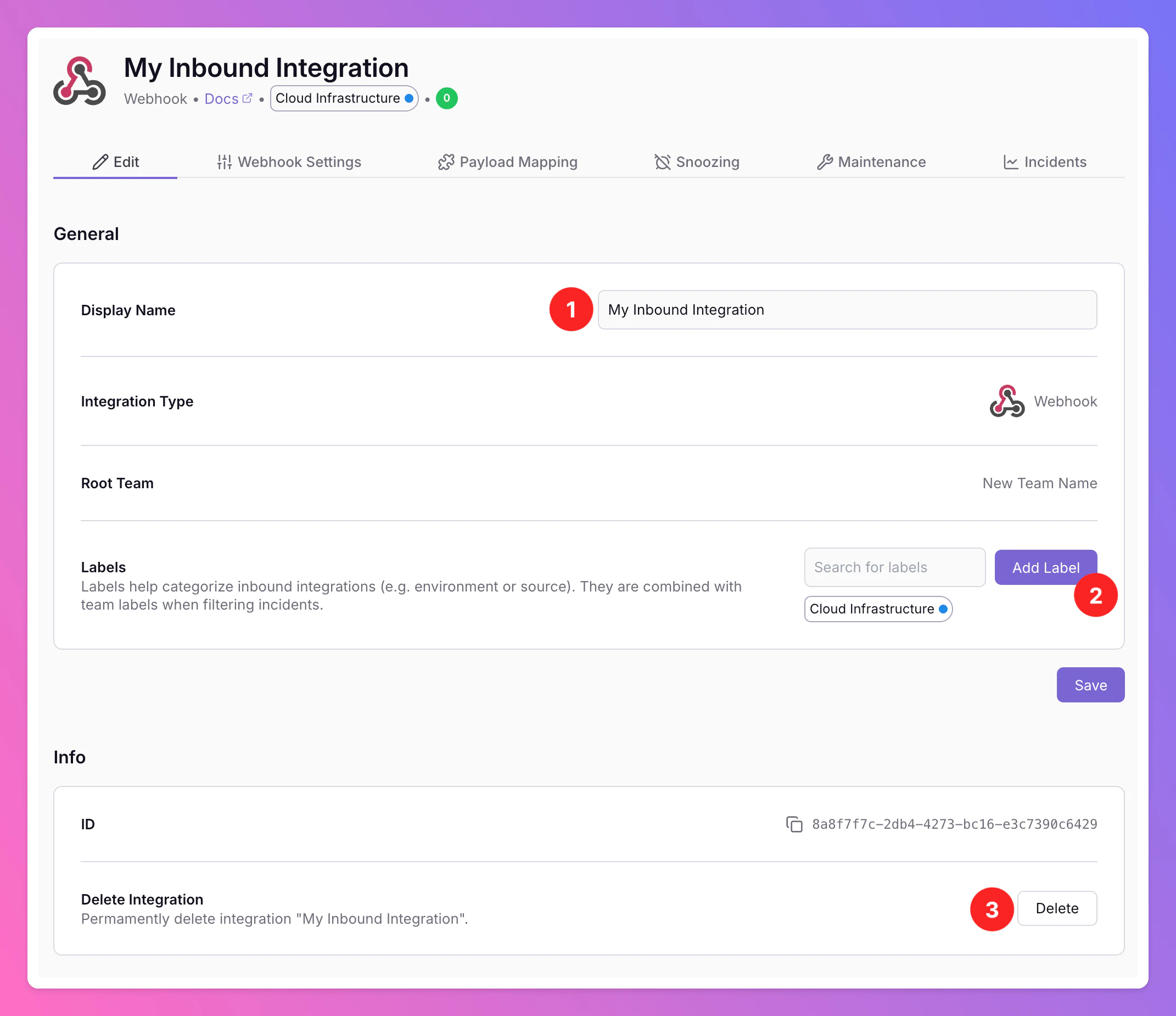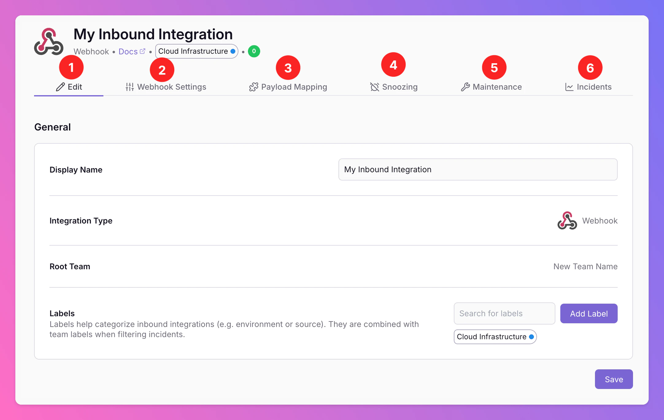 Labelsto your integration. Labels help categorize inbound integrations (e.g. by environment or source). They are combined with team labels when filtering incidents.