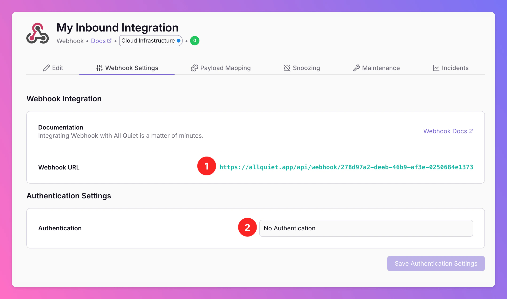 Settingstab of the integration details page. Here you can find integration’s unique Webhook URL. Every request sent to this address will show up as a new payload in thePayload Mappingtab, from which we’ll extract attributes and map these to incidents. - Some integration types allow for some more specific settings. E.g. for Inbound Webhooks, you may set up integration-specific authentication.