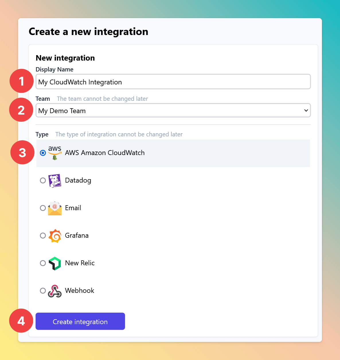 - Enter a display name for your integration, e.g. “AWS CloudWatch Integration”.