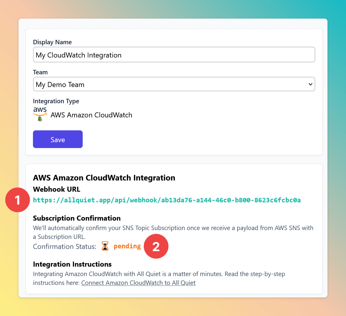 Login into your All Quiet account.Create AWS Amazon CloudWatch Integration