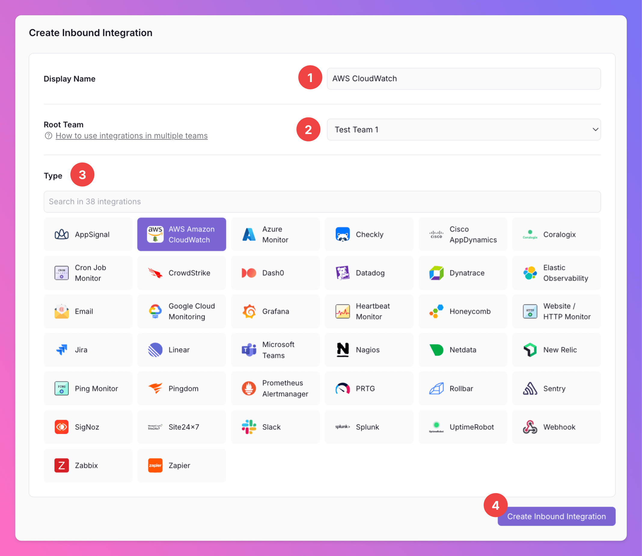 Display Namefor your integration, e.g. “AWS CloudWatch”. - Select a