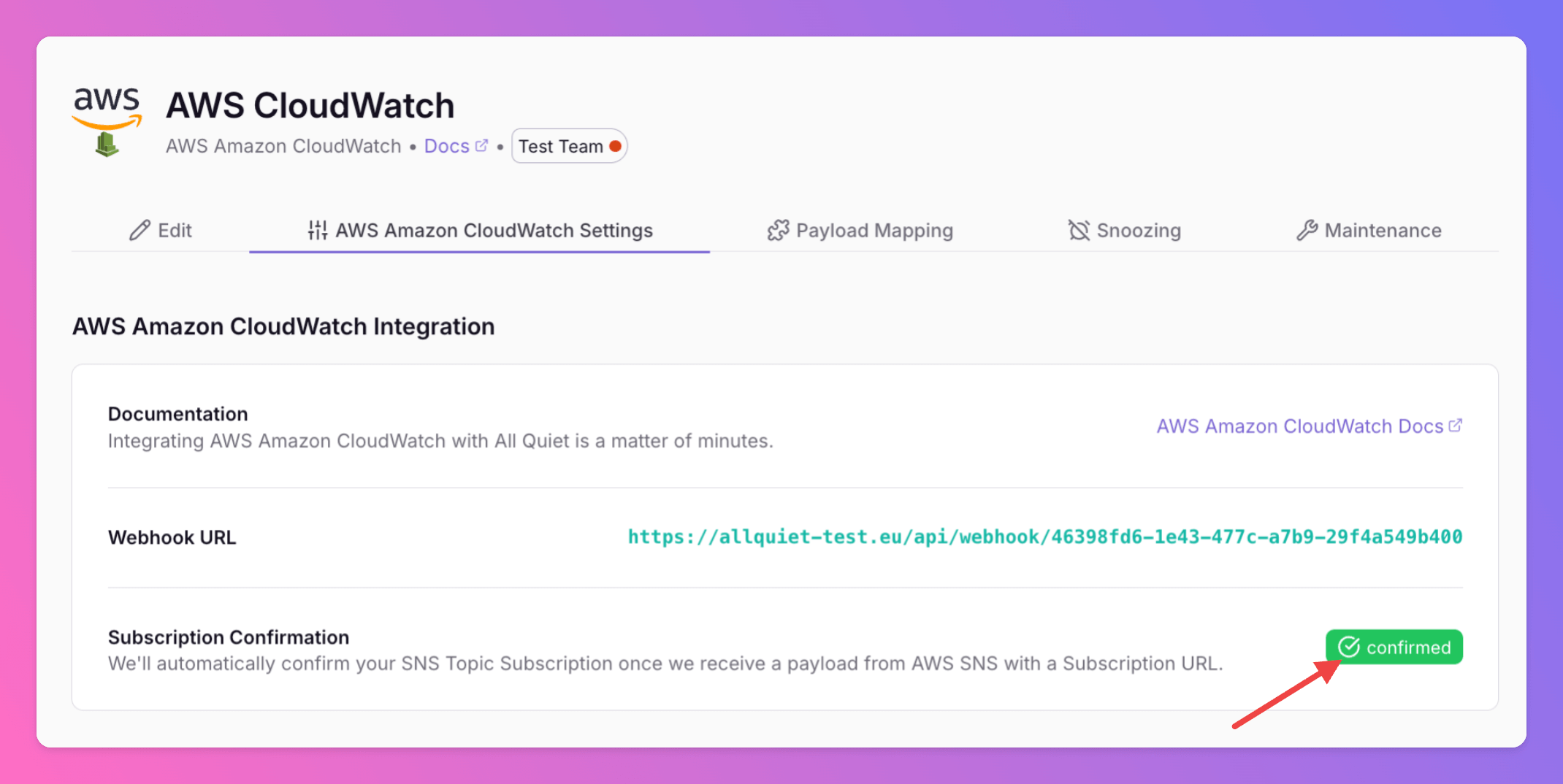 - AWS SNS requires HTTPS subscriptions (“Webhooks”) to be confirmed by the subscriber. This is done by visiting a subscription URL which AWS sends to the webhook in a payload. All Quiet automatically confirms this URL. When you’ve just created your AWS Amazon CloudWatch Integration the confirmation status will be pending.