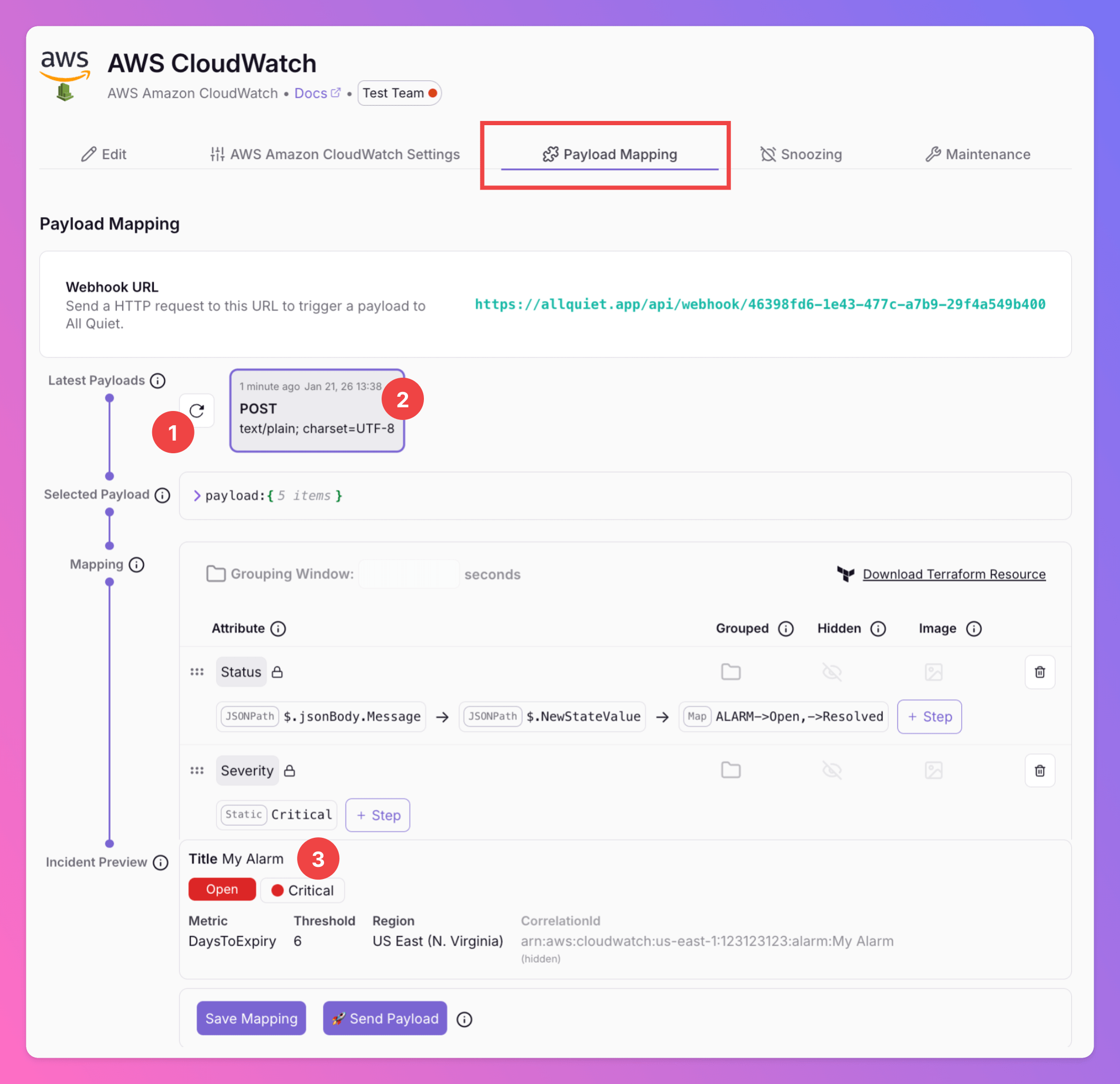 - You can see how the mapping will transform this AWS Amazon CloudWatch payload to an All Quiet incident.