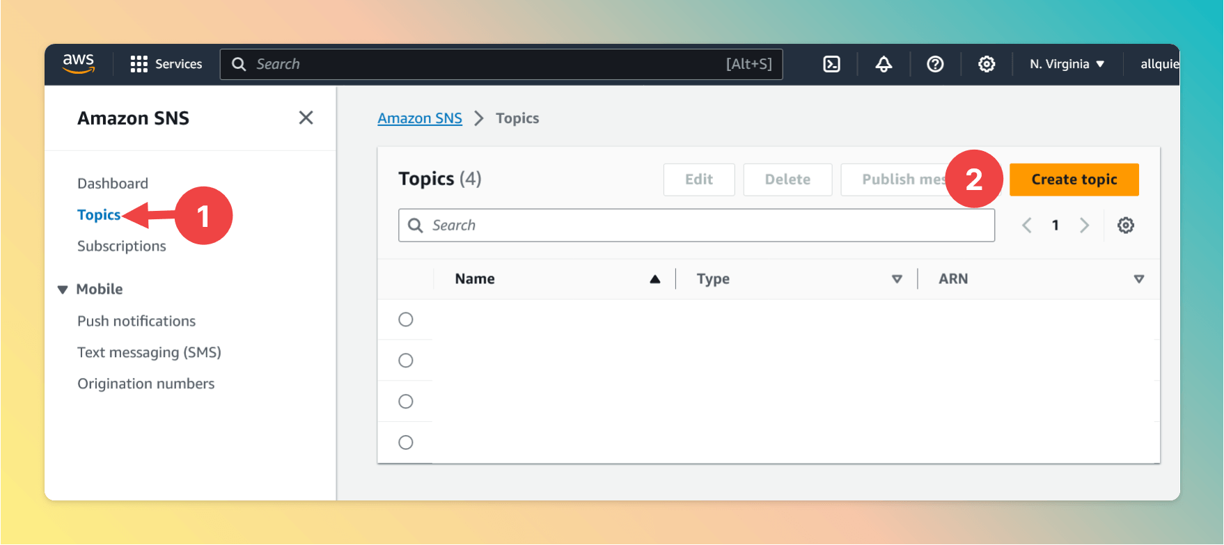 - In the AWS “Simple Notification Service” (SNS) section, navigate to “Topics”.