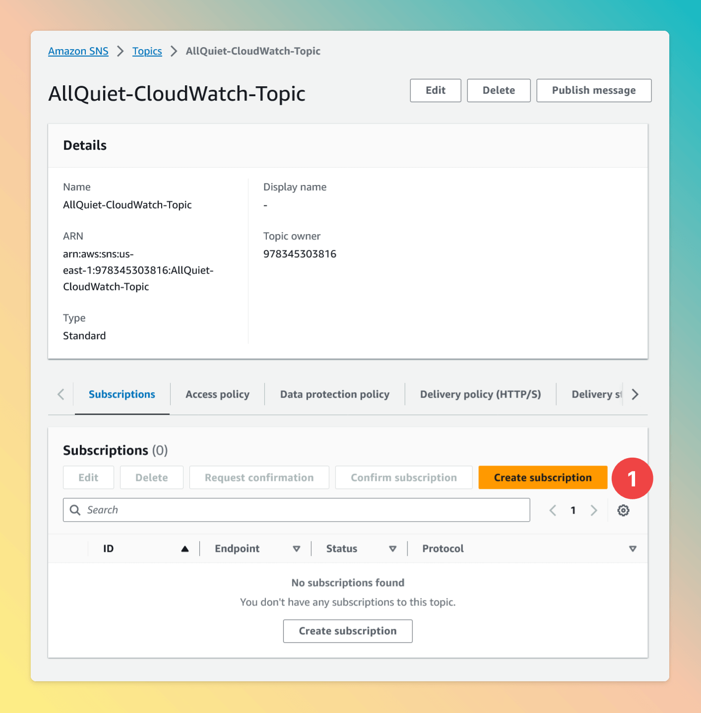 - Choose a name for your new topic, e.g. “AllQuiet-CloudWatch-Topic”.