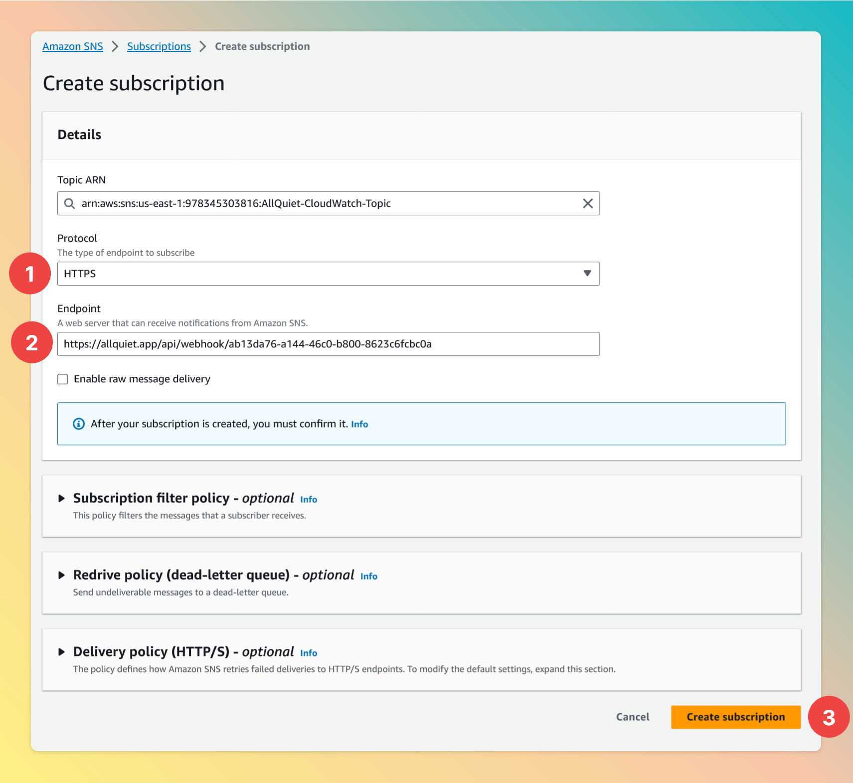 - AWS SNS requires HTTPS subscriptions (“Webhooks”) to be confirmed by the subscriber. This is done by visiting a subscription URL which AWS sends to the webhook in a payload. All Quiet automatically confirms this URL.
