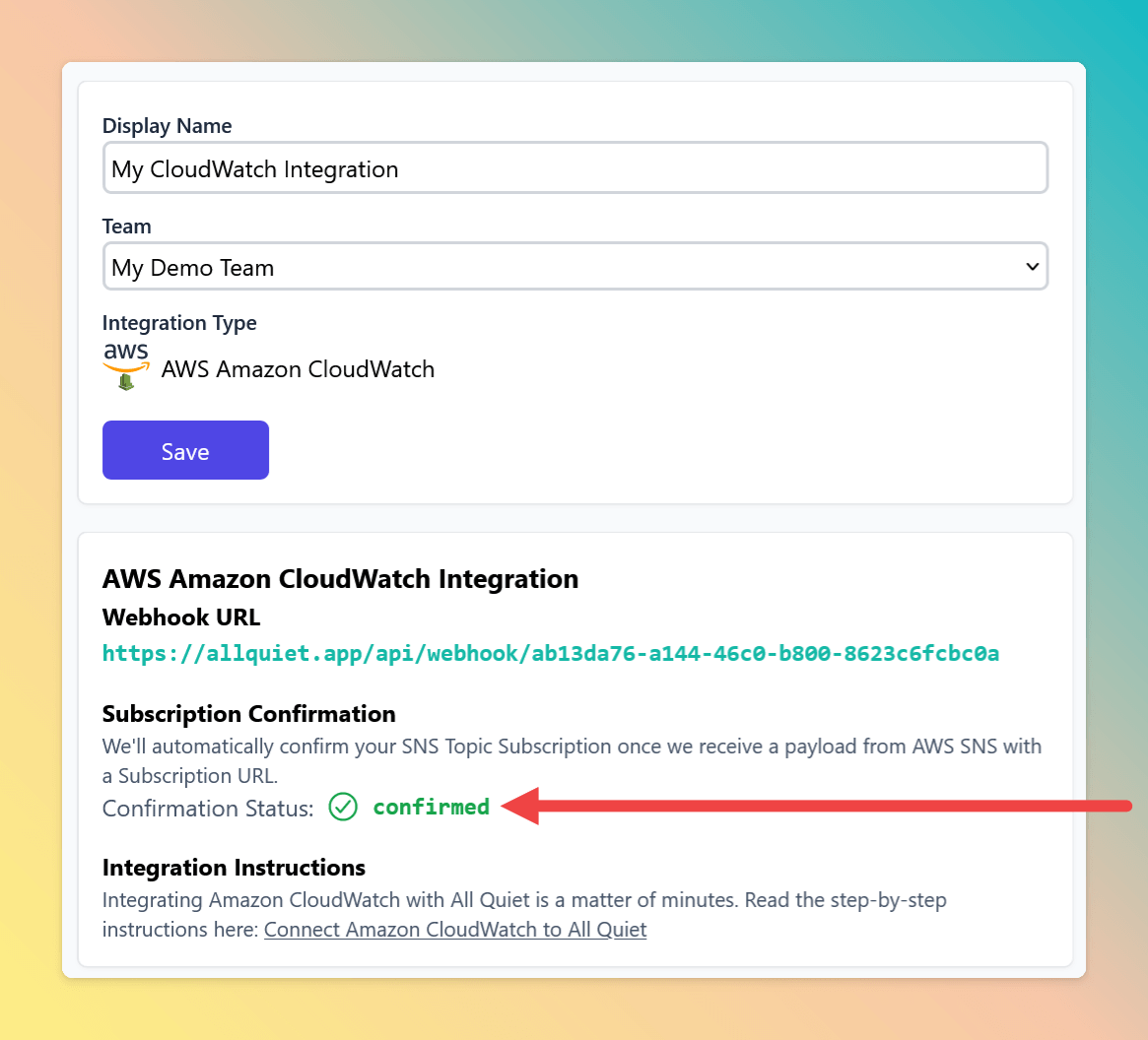 Your AWS Amazon CloudWatch is now successfully integrated with All Quiet, enhancing your incident management capabilities.