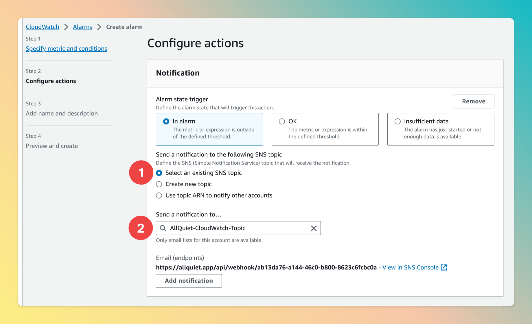 - Choose “Select an existing SNS topic” when creating or editing your AWS CloudWatch alarms.