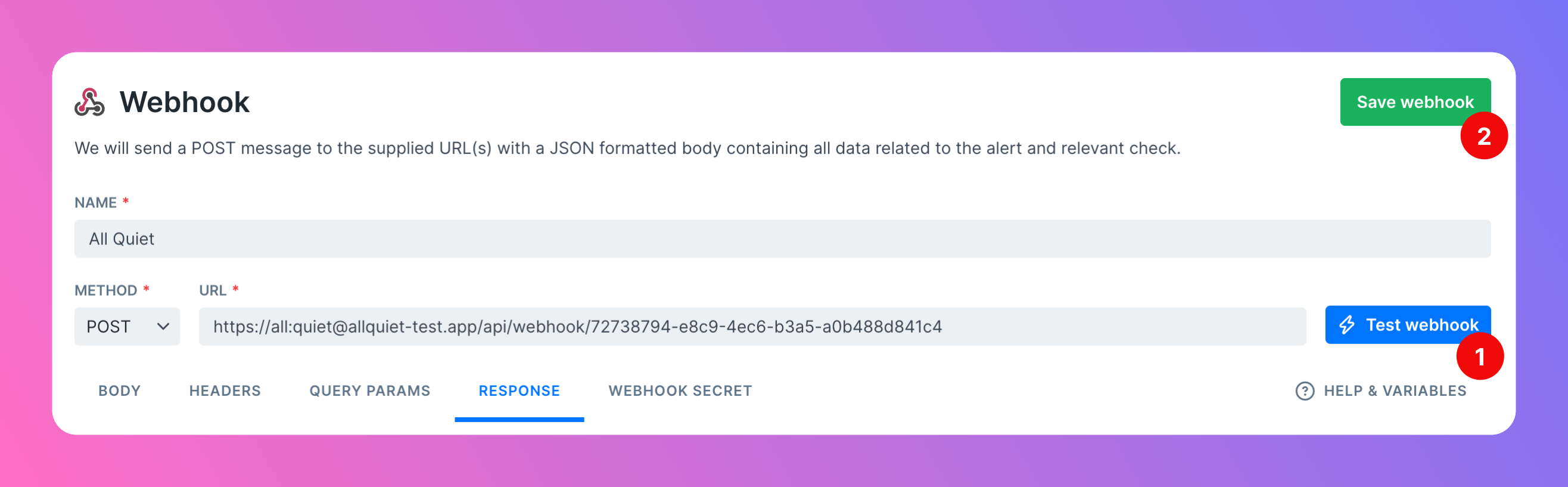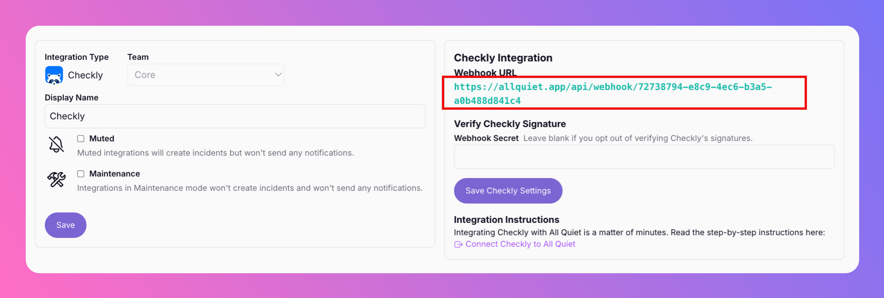 After creating the integration on All Quiet, you can view and copy the webhook URL. You will require this URL in step 2 when configuring the custom integration on Checkly.