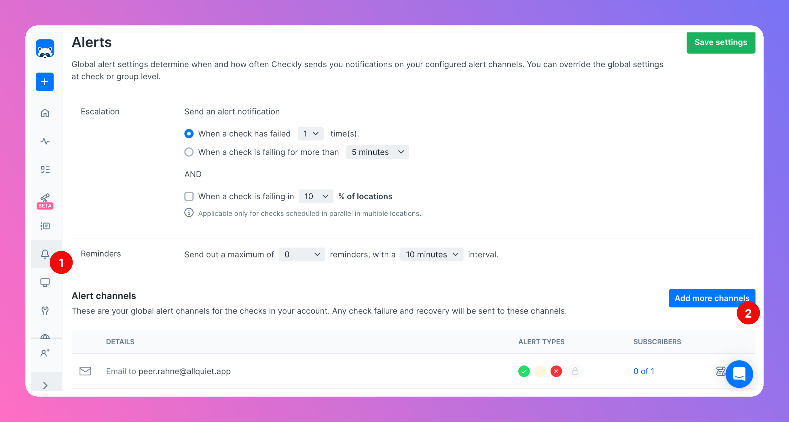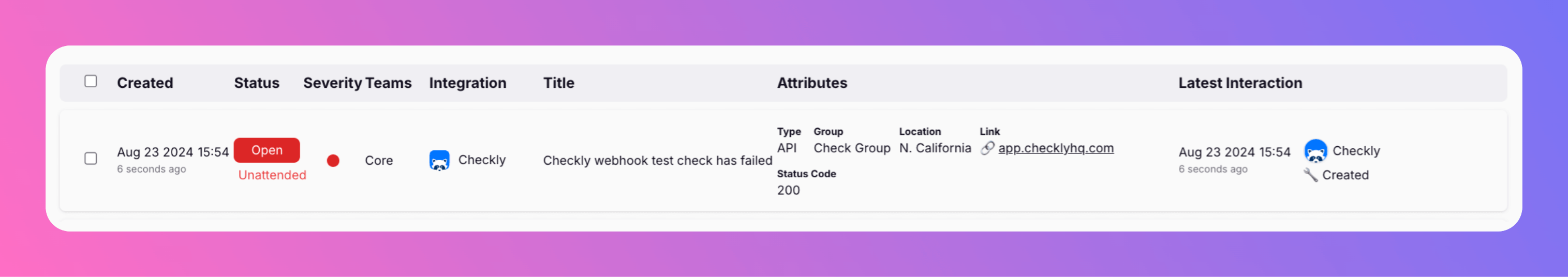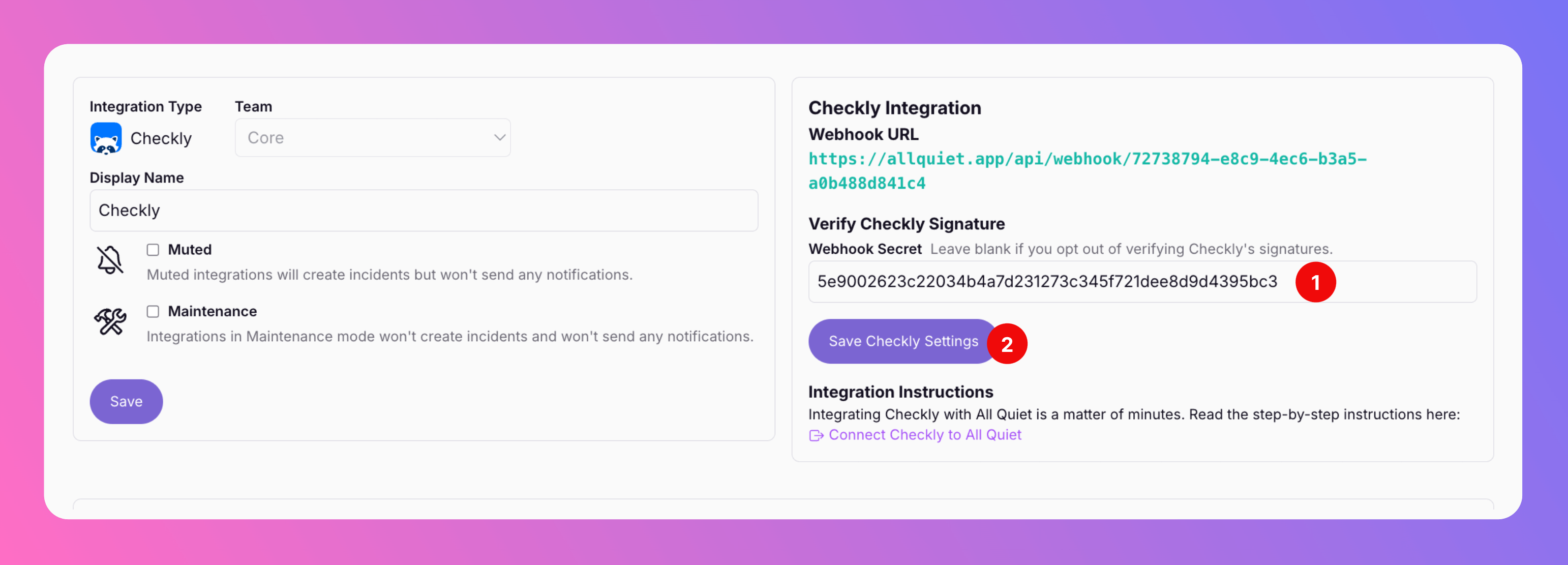You’re ready to go. If you set up your integration this way, Checkly will send alerts for all of your checks to All Quiet.