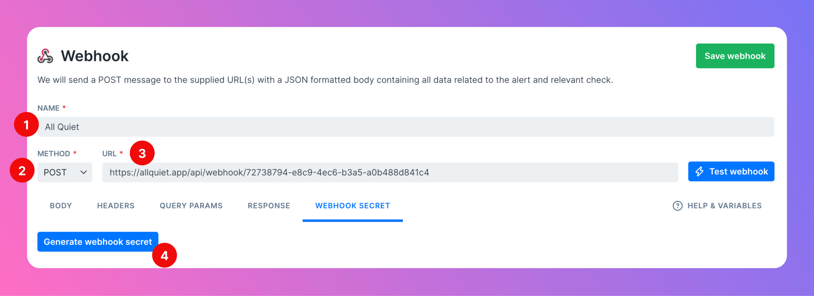 as we want to forward alerts to All Quiet. - As URL, paste in the All Quiet webhook URL you’ve obtained in step Get The All Quiet Webhook URL.