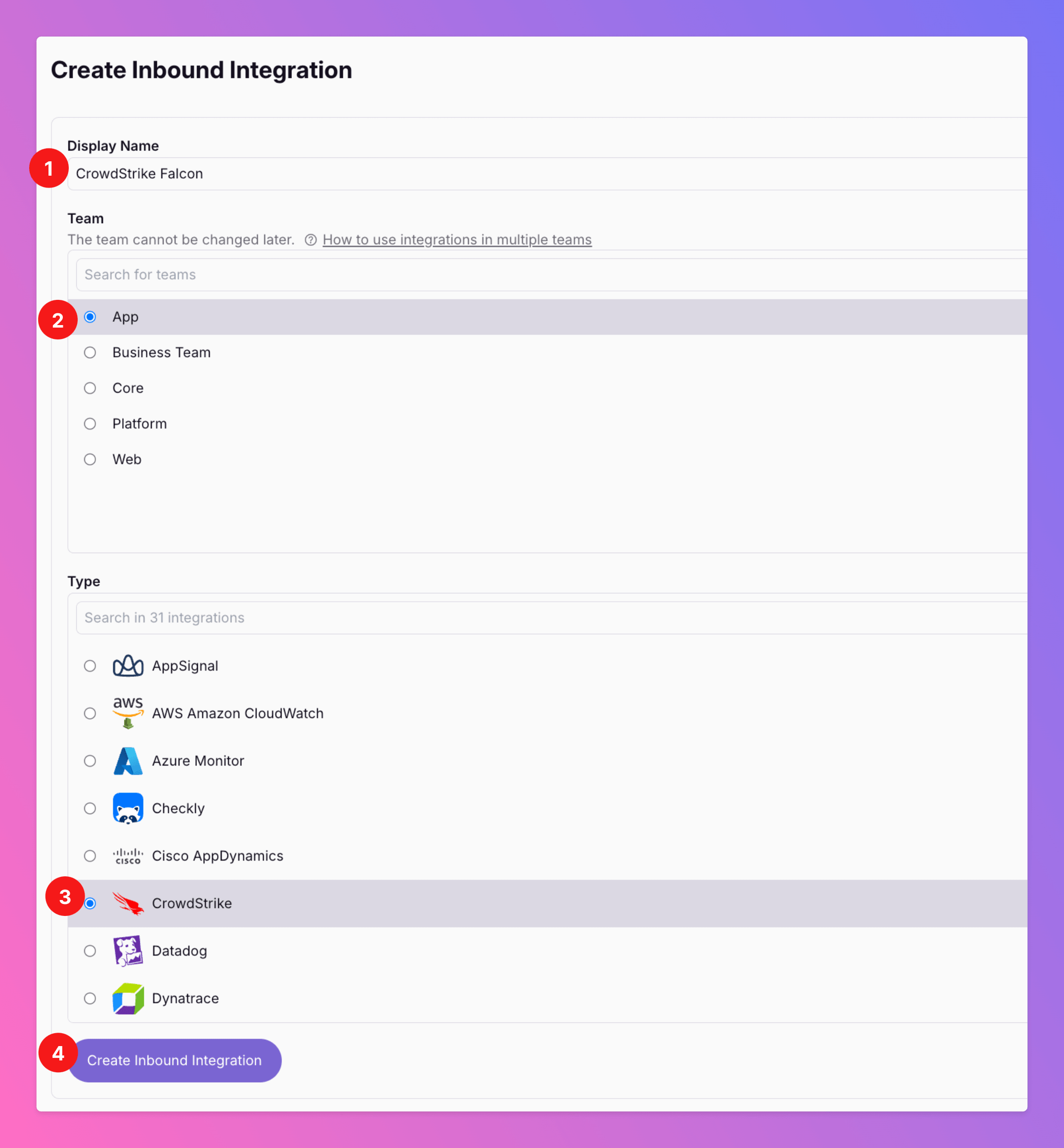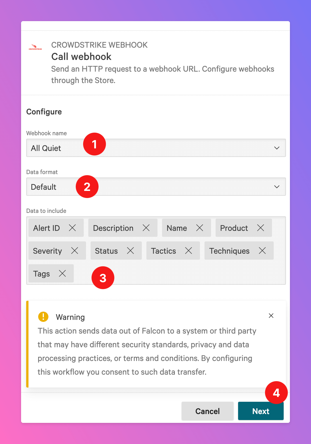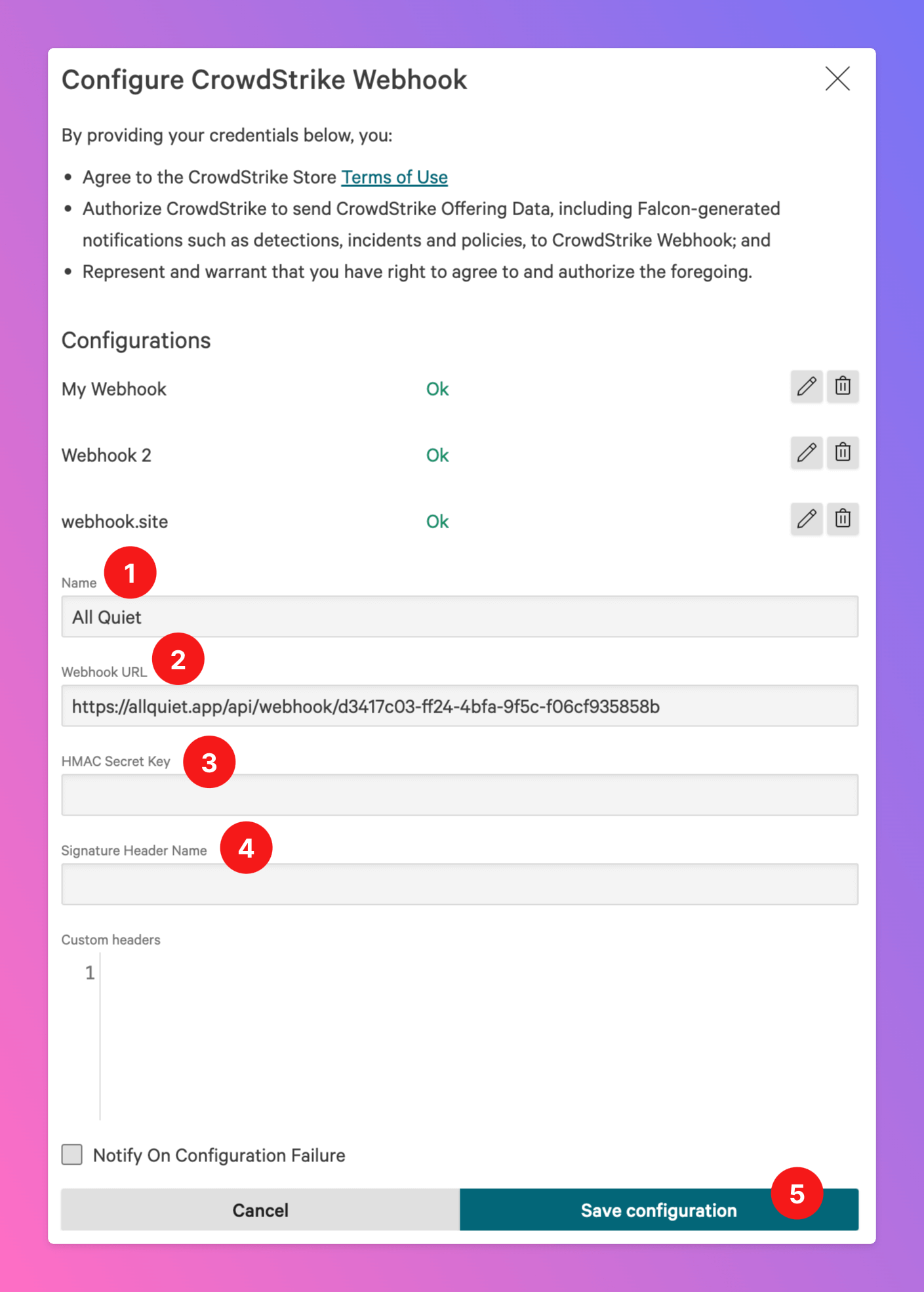 Once you’ve set up an integration of type “CrowdStrike” with All Quiet, it takes only three more steps in your CrowdStrike account to finish off your setup.Set up the Webhook to All Quiet