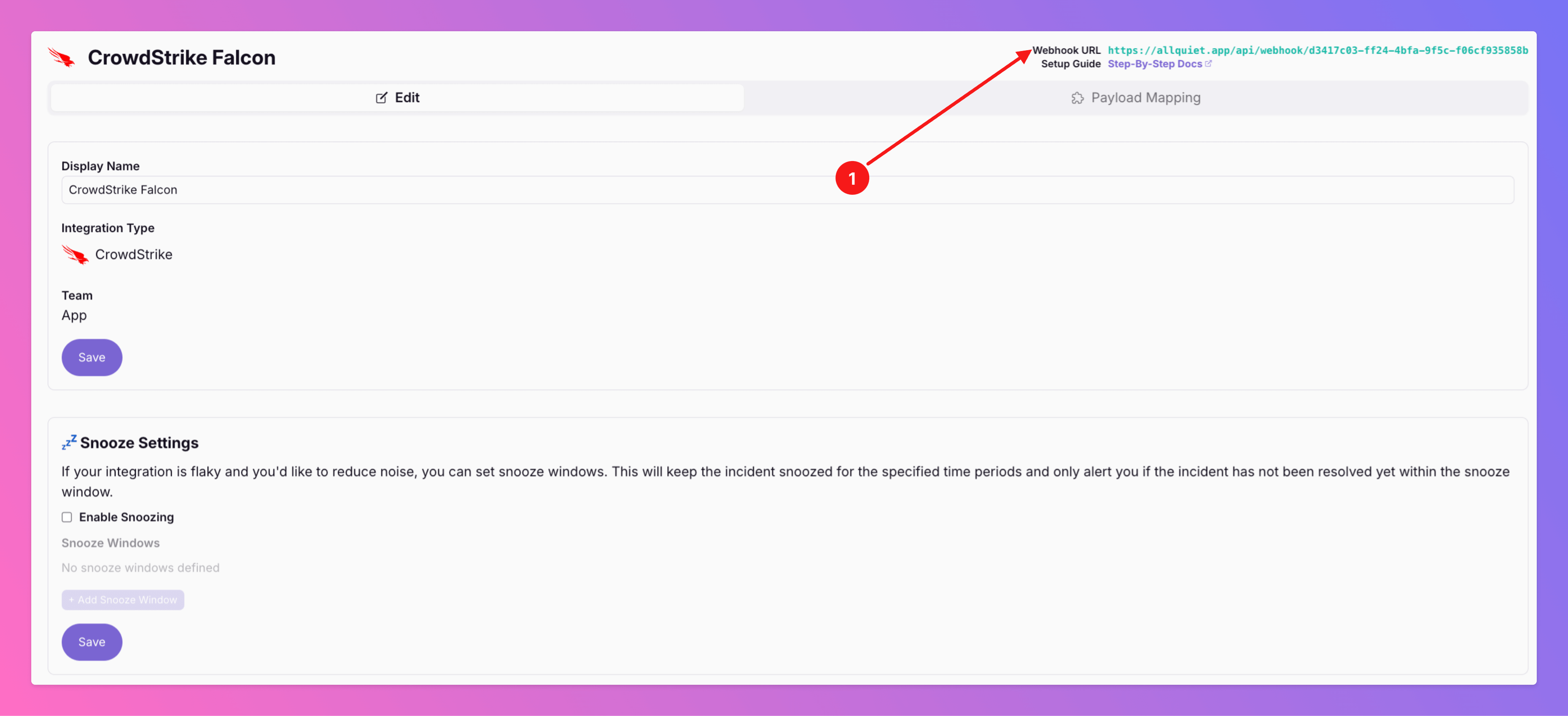 After creating the integration on All Quiet- you can view and copy the webhook URL. You will require this URL in step 2 when configuring the custom integration on CrowdStrike.