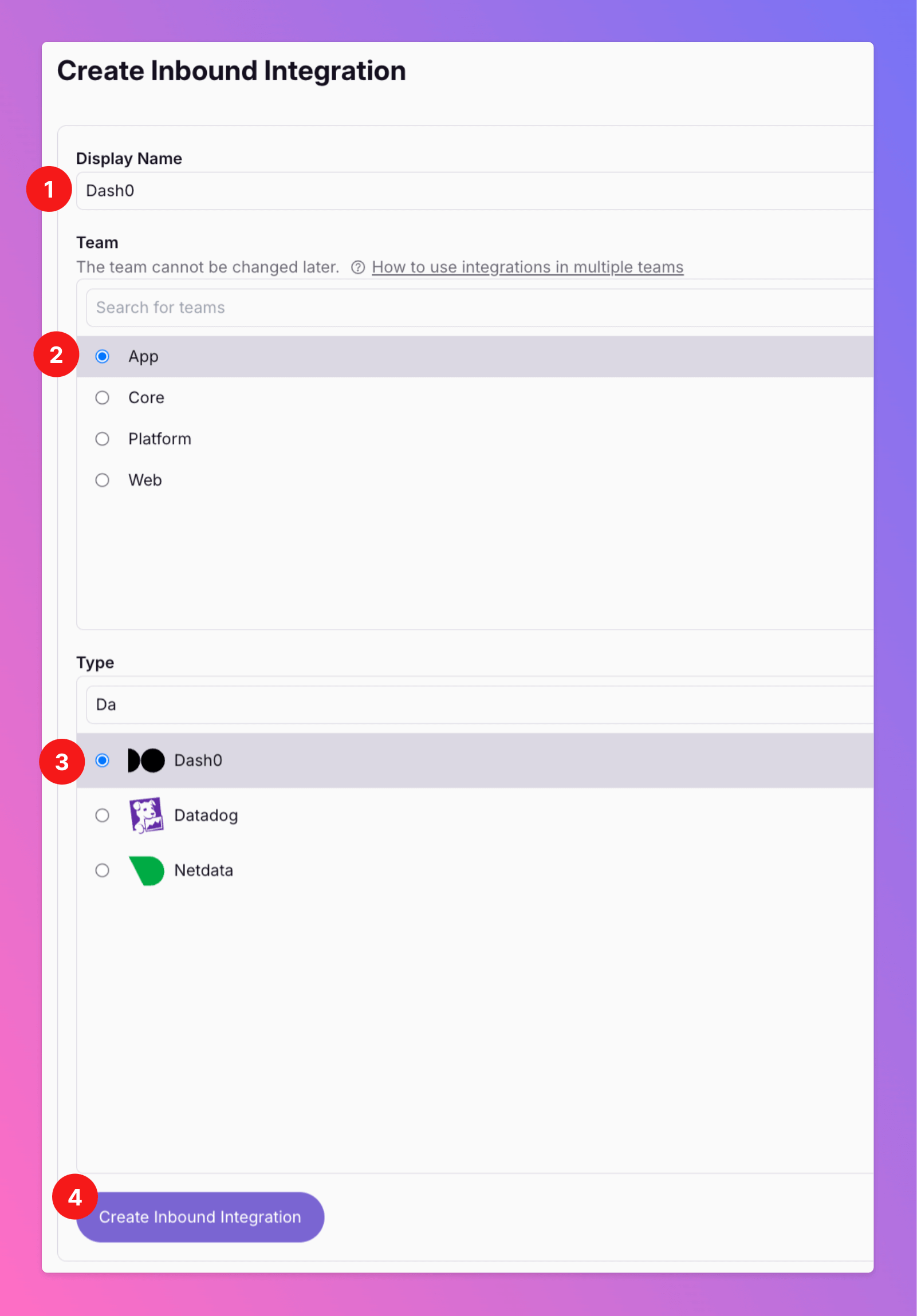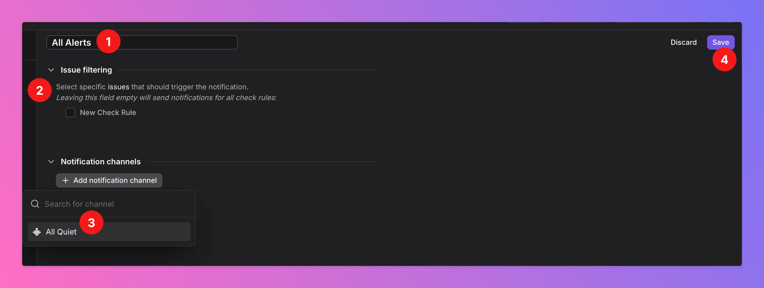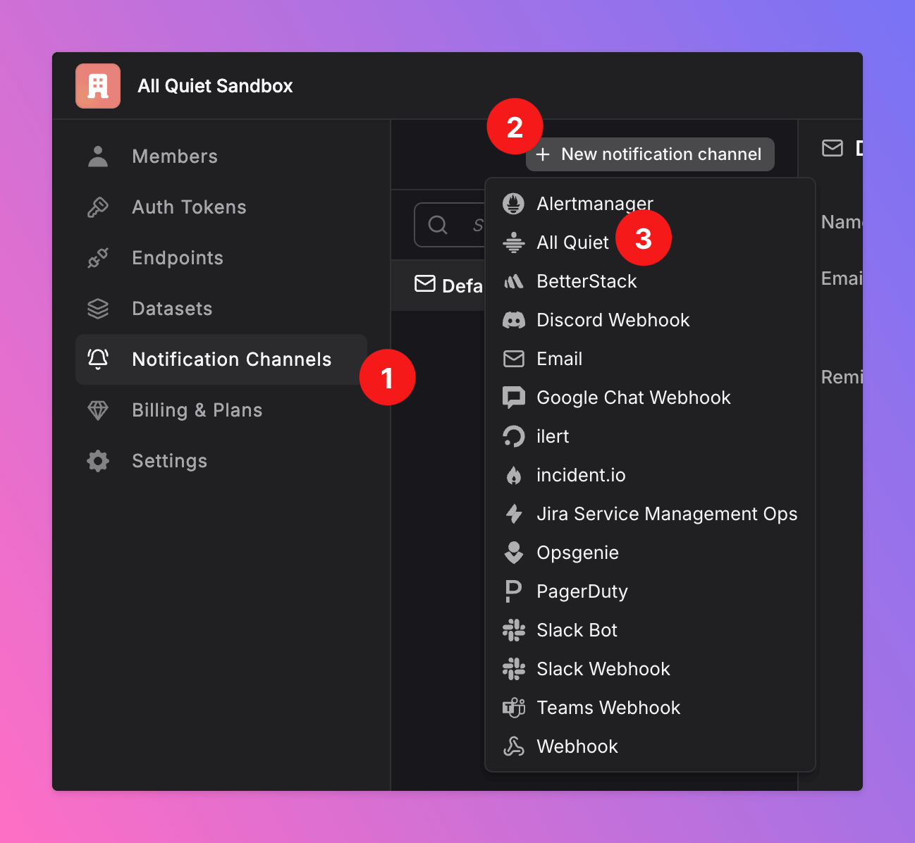 Once you’ve set up an integration of type “Dash0” with All Quiet, it takes only two more steps in your Dash0 account to finish off your setup.Set up the Notification Channel