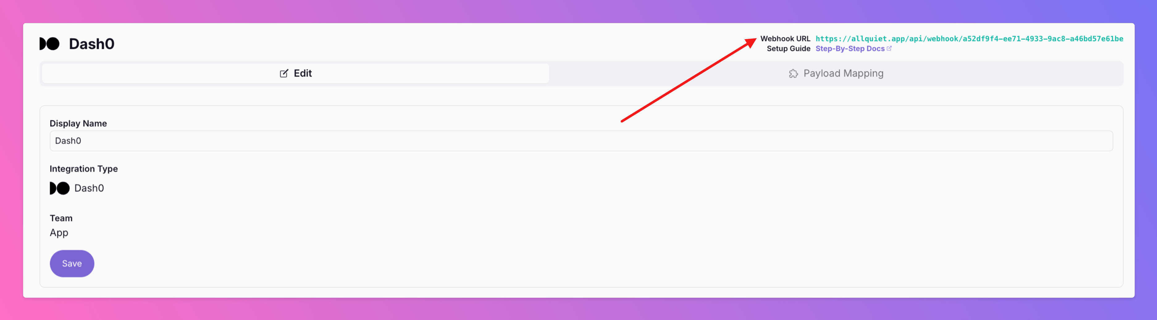 After creating the integration on All Quiet, you can view and copy the webhook URL. You will require this URL in step 2 when configuring the custom integration on Dash0.