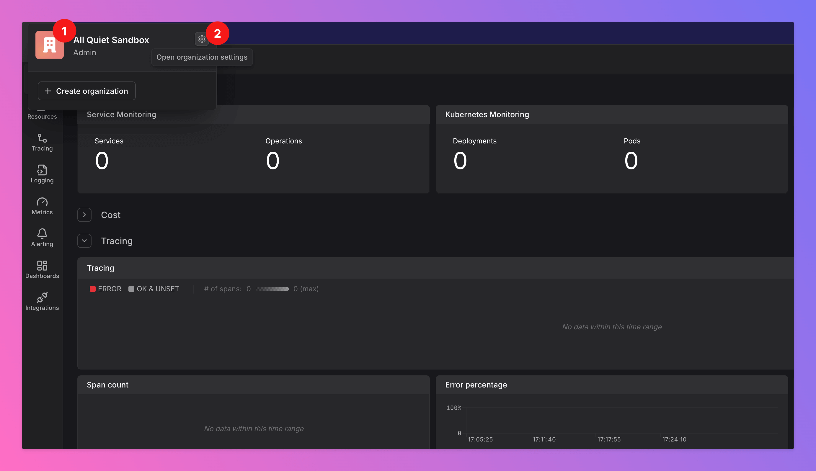 Sign in to your Dash0 Account. We first need to create the Notification Channel that allows us to connect Dash0 with All Quiet.- From the home screen, click on your organization.