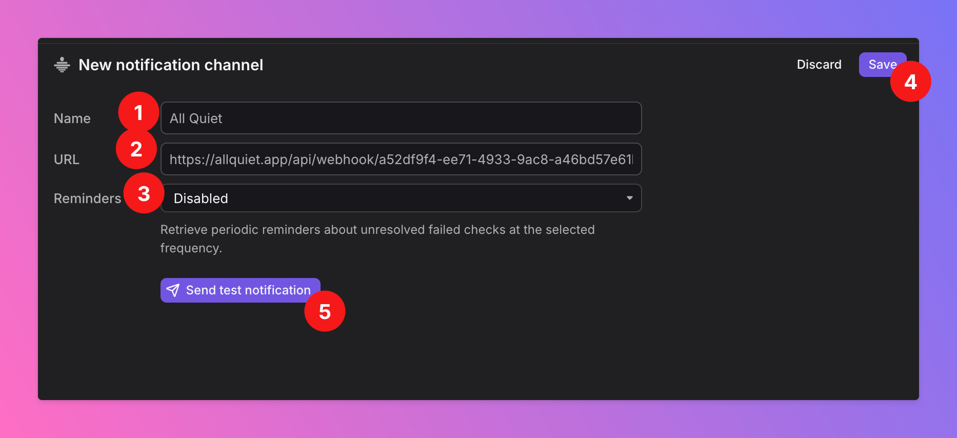 - Optional: Send a test alert. If the notification channel is configured correctly, you will find a test incident in your connected All Quiet account.