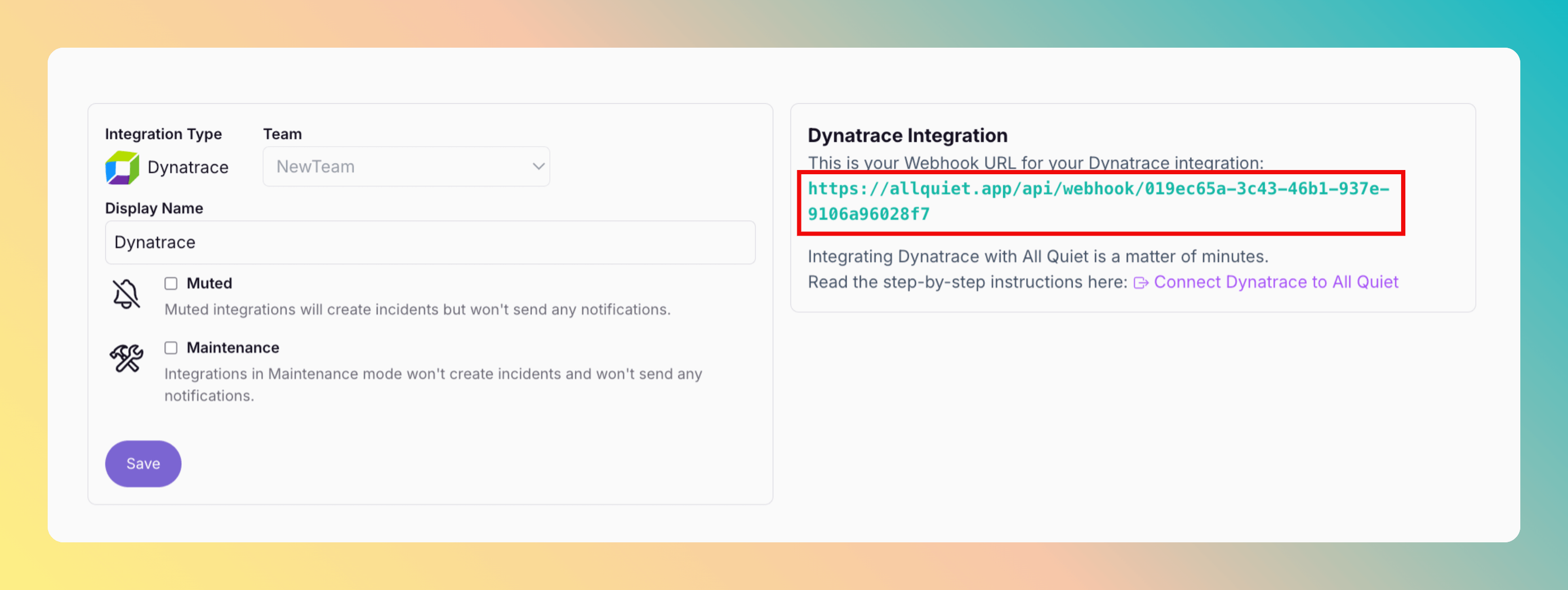 After creating the Dynatrace integration on All Quiet, you can view and copy the webhook URL. You will require this URL in step 2 when configuring the custom integration on Dynatrace.