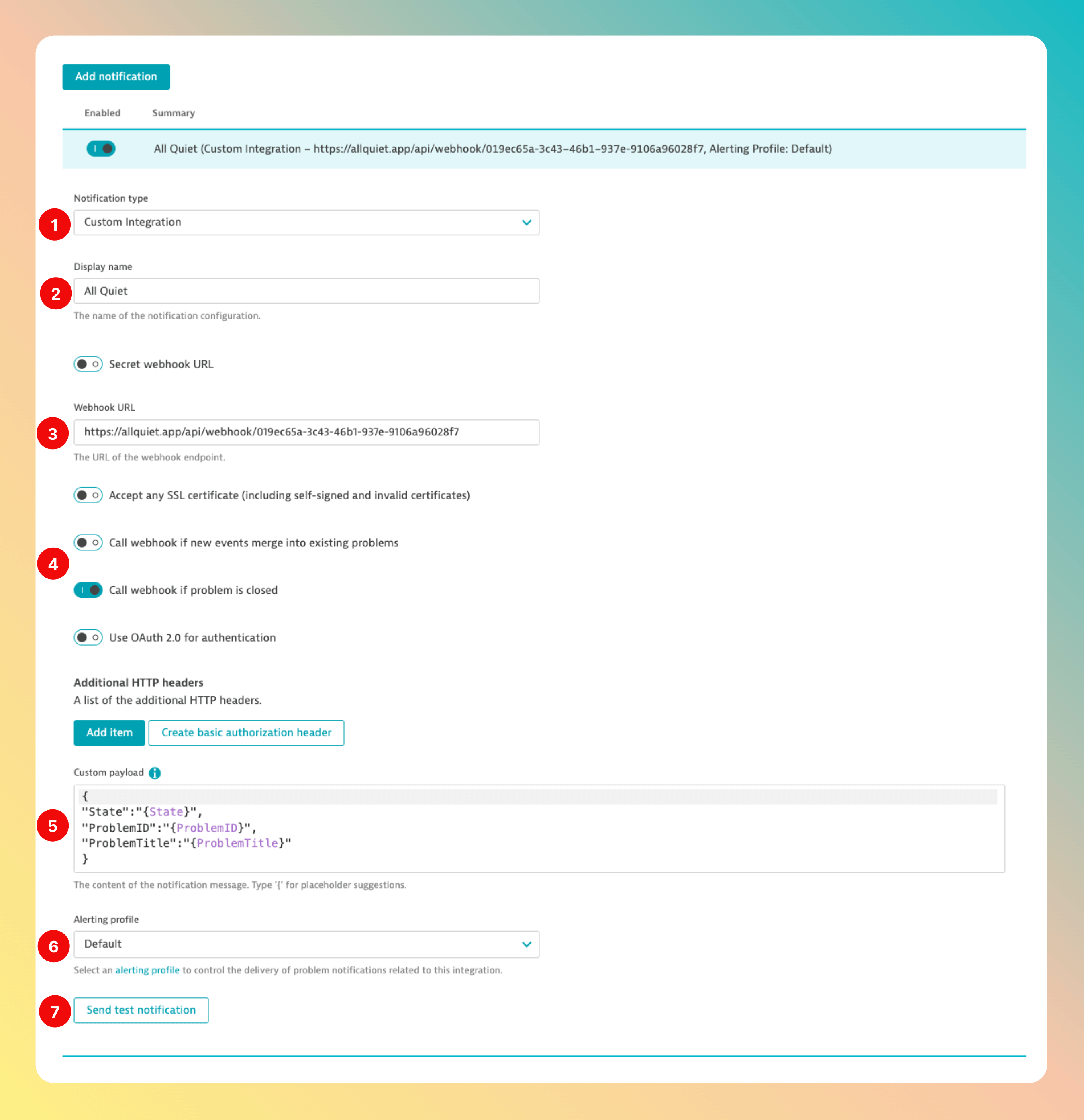 , e.g. “All Quiet” - Paste in the All Quiet webhook URL you’ve obtained in step Get The All Quiet Webhook URL.