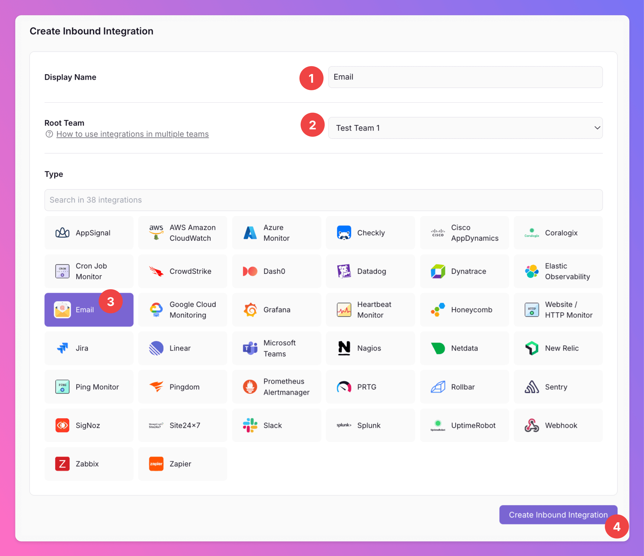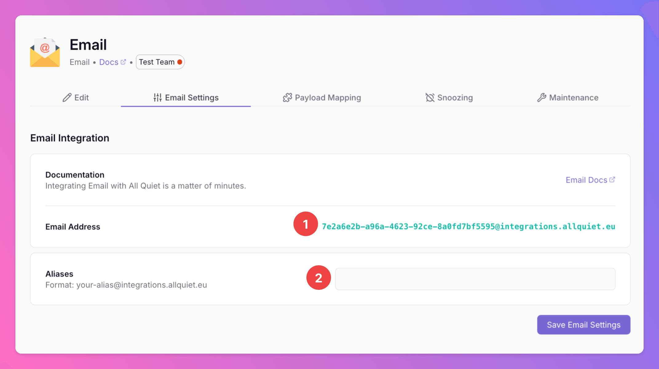 Email Settings. This is the address you’ll use to send emails that automatically create incidents in the integration’s team. - If you prefer to use a different email address, you can set up aliases in here.