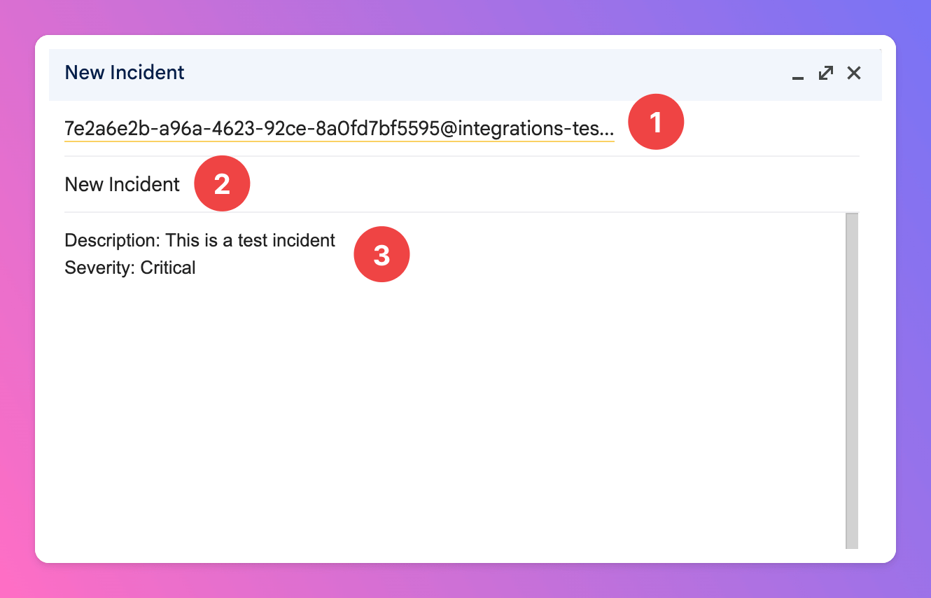 Begin by opening your preferred email client to compose a test message. This is simply a dry run to understand how emails are turned into structured incident reports in All Quiet. The exact content isn’t important - it’s just to illustrate the process. Once your email client is open, follow these steps:- As recepient, select the unique email address generated by your All Quiet email integration setup (or one the aliases you added).