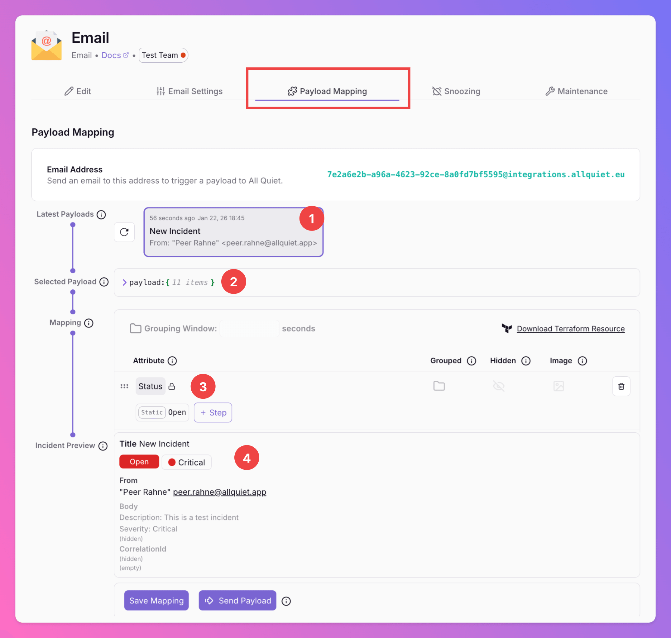 Back in All Quiet, open thePayload Mapping tab of your Email integration.
