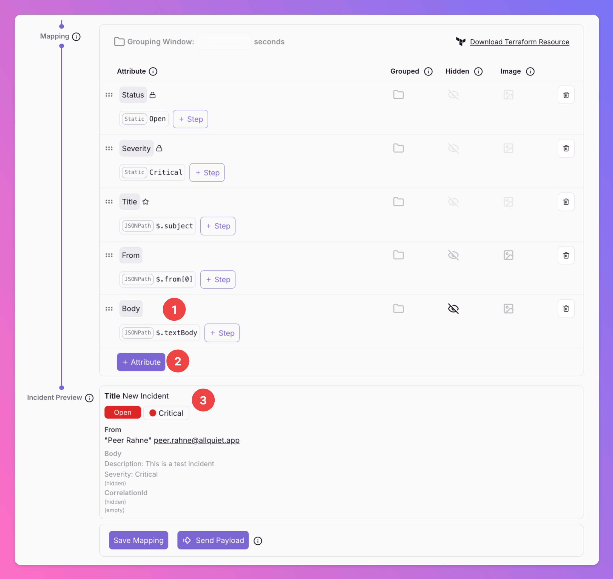 - Use the payload mapping to ensure the content of the email is mapped to an All Quiet incident that work for you. More details below