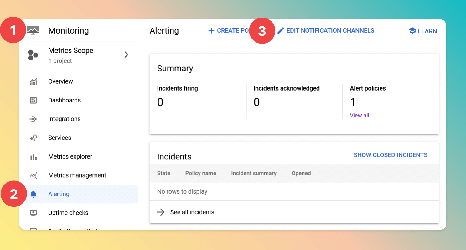 - Navigate to the “Monitoring” section of your Google Cloud Console.