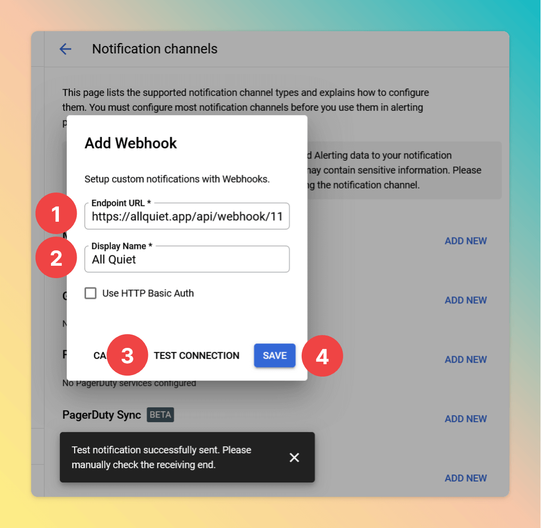 - Click “TEST CONNECTION” to send a test payload to the All Quiet webhook.