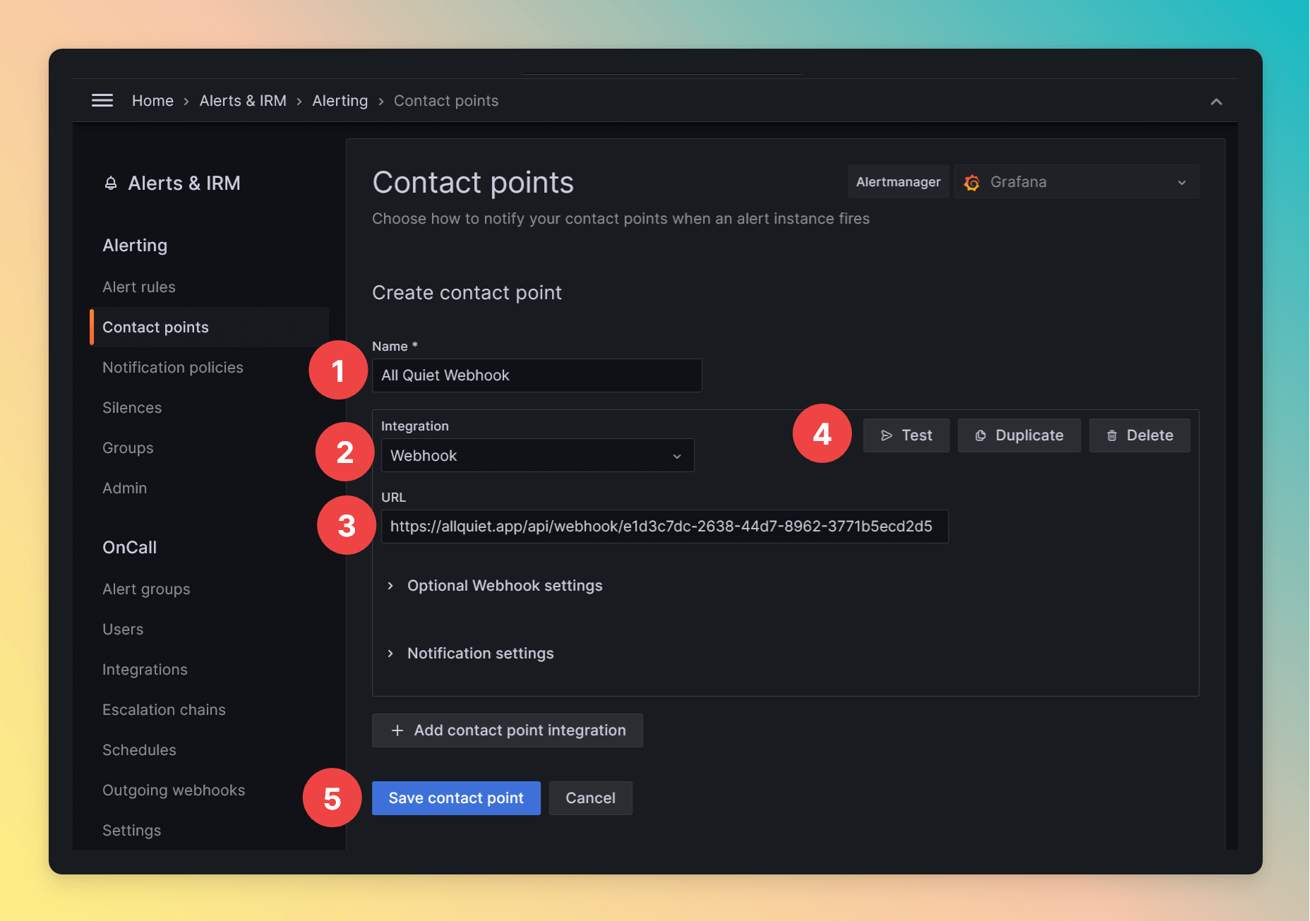 - Choose a name for your contact point, e.g. “All Quiet Webhook”.