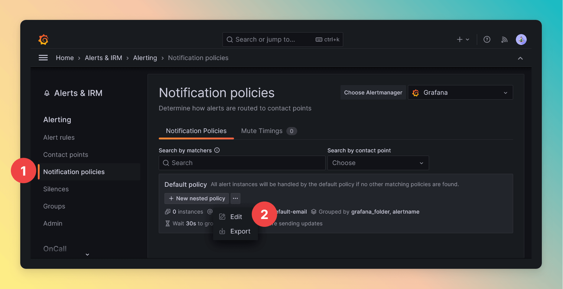 - Navigate to “Notification policies” under “Alerting”.