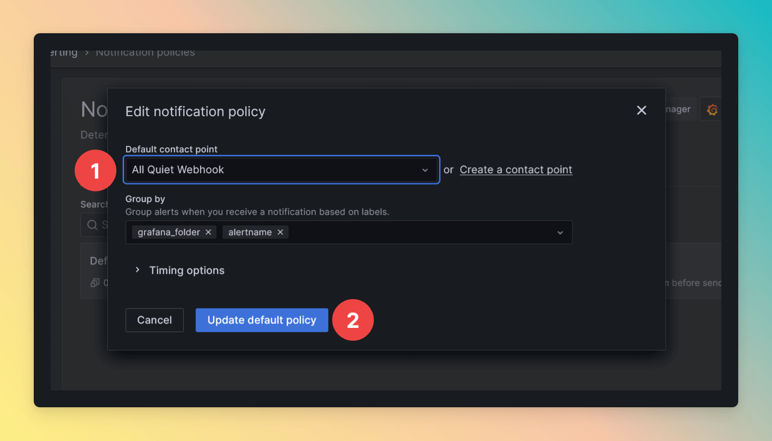 - Select your All Quiet Webhook as the default contact point.