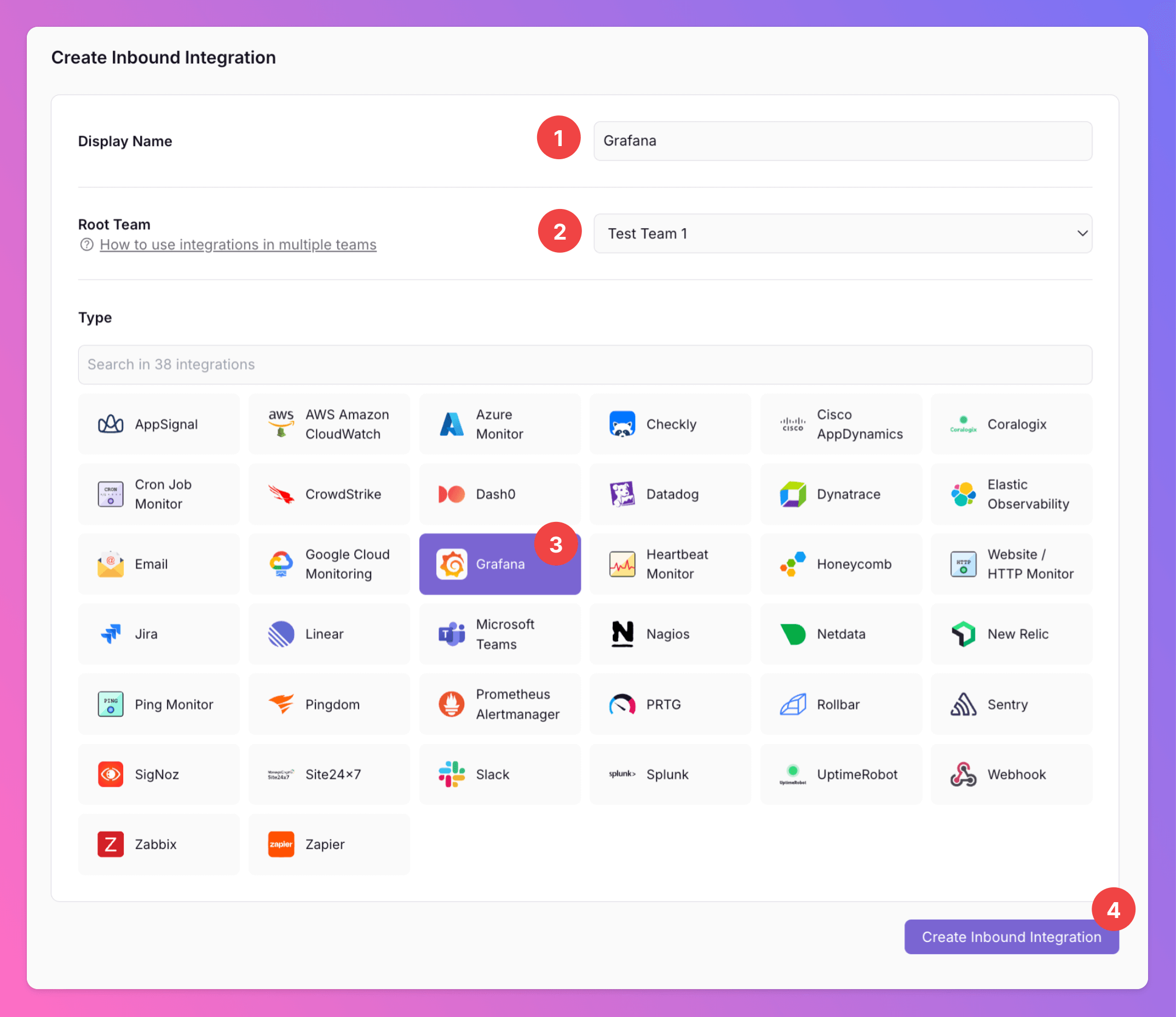Display Namefor your integration, e.g. “Grafana”. - Select a