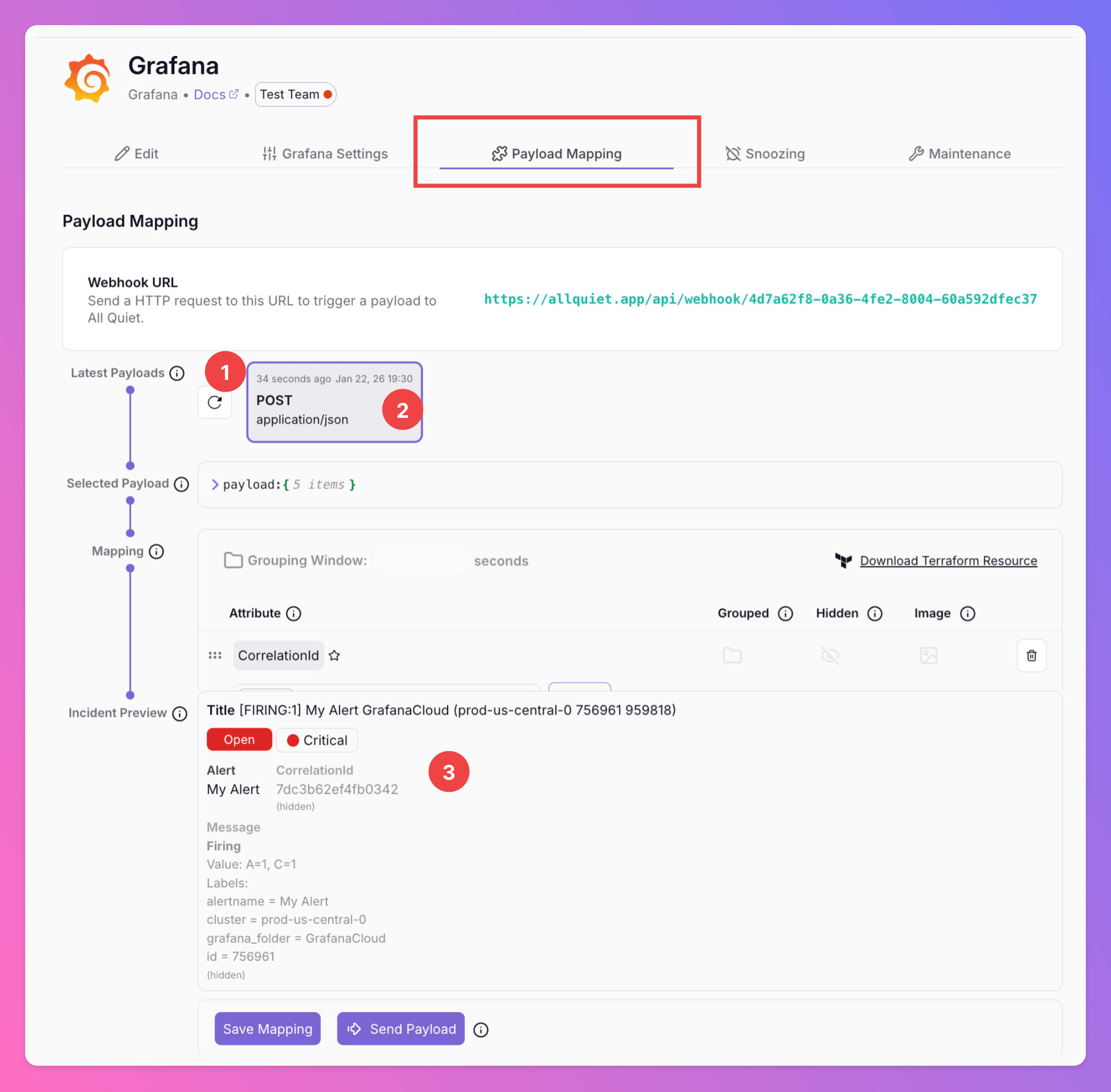 - You can see how the mapping will transform this Grafana payload into an All Quiet incident.