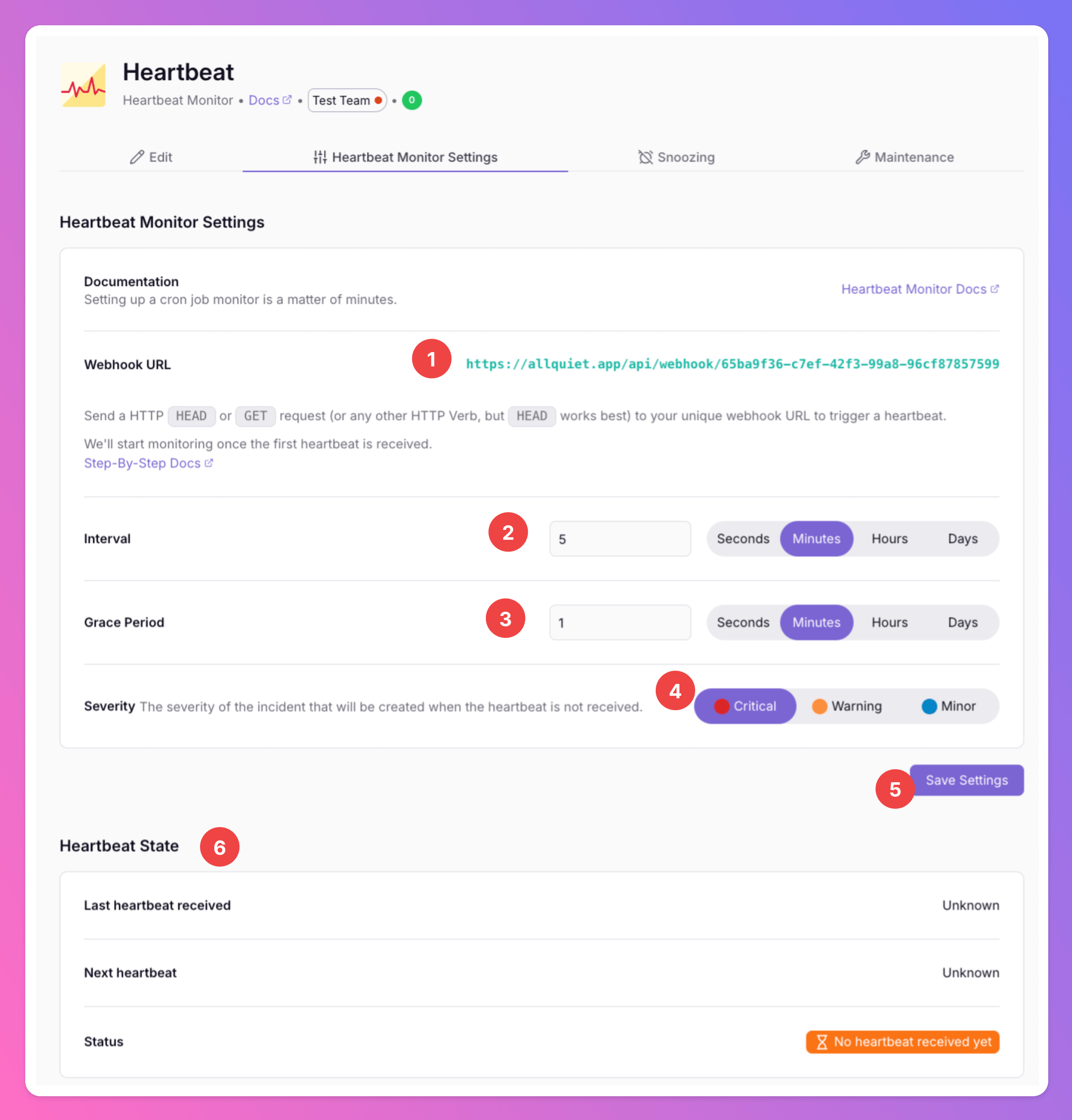 Gace Period. If the heartbeat is delayed and not sent in theIntervalbut still sent to our Webhook URL within theGrace Periodfollowing theInterval, we will not create an incident. - Define a severity for incidents being created if the Heartbeat Monitor fails.