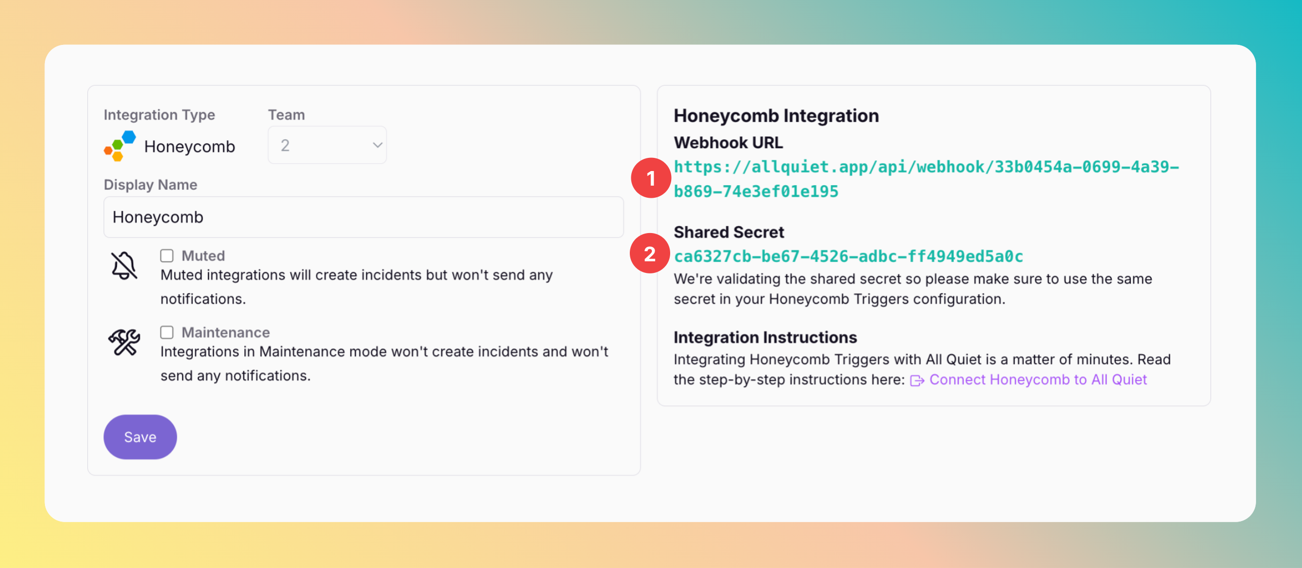 Go back to your All Quiet Honeycomb integration that you’ve created in step Create a Honeycomb Integration.- Click