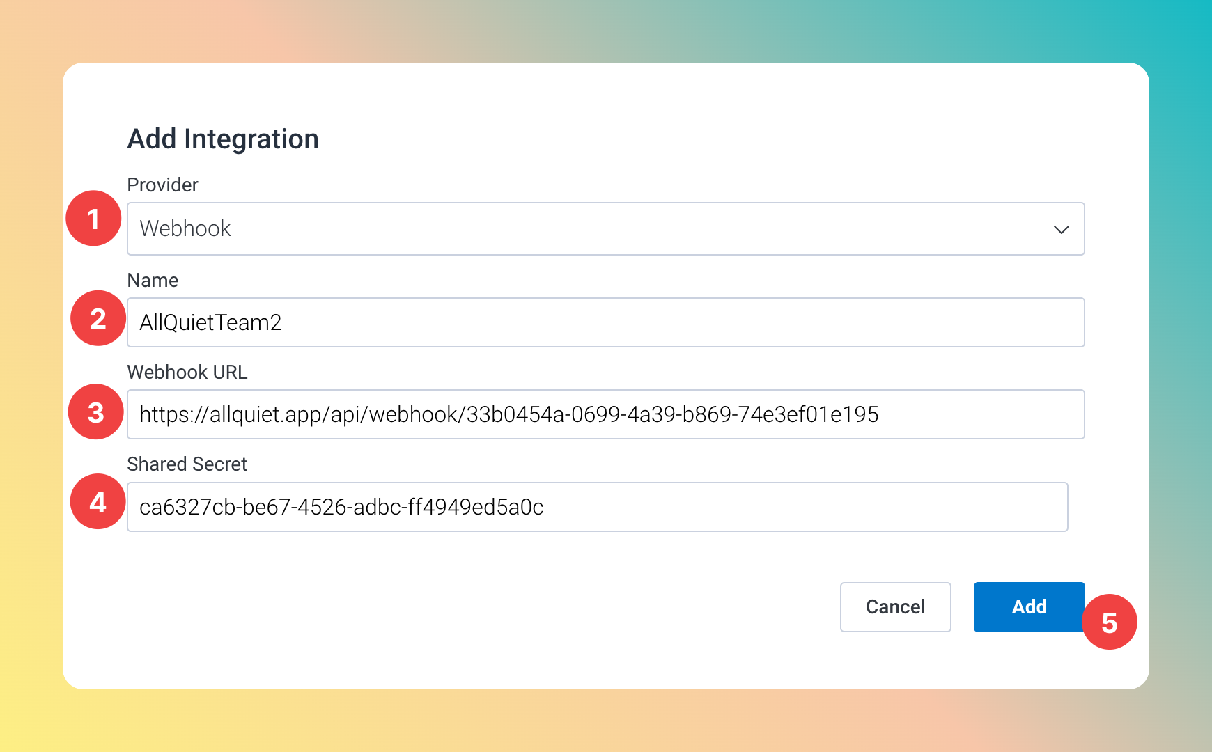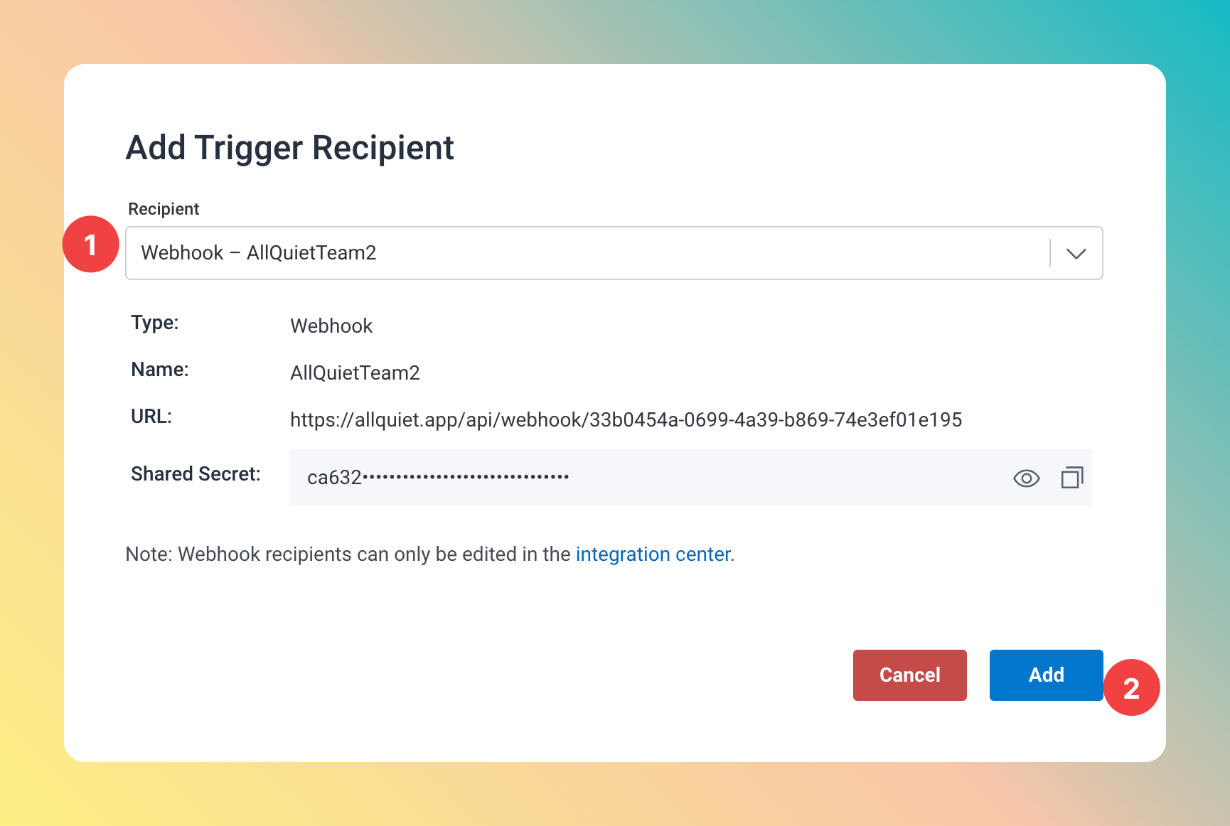 - Paste in the shared secret you’ve obtained in step Get The All Quiet Webhook URL and shared secret.
