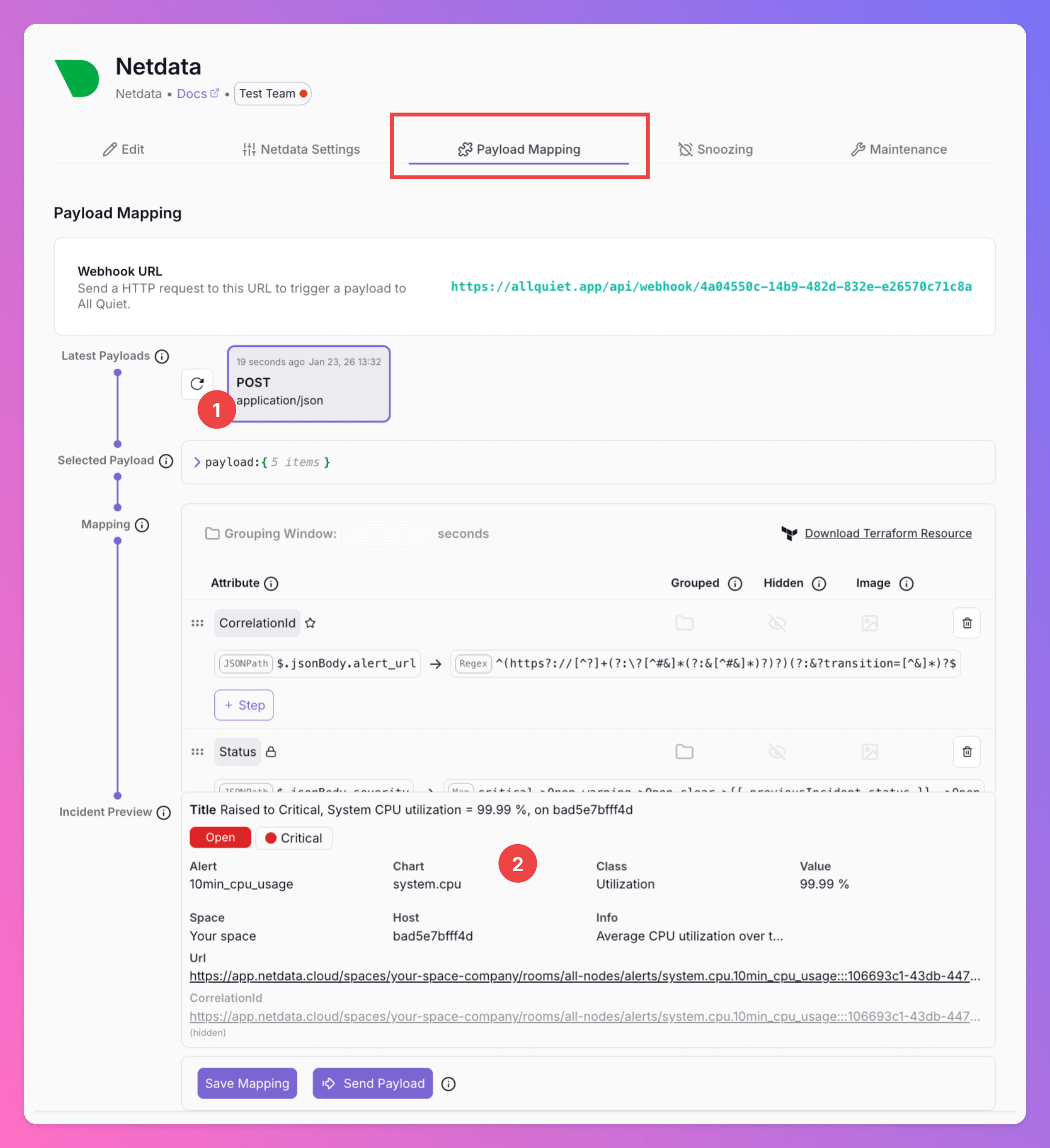 - We cannot map the test notification as it missing some required attributes that we need to create incidents. Howewer, our predefined mapping engine will be able to create incidents from real Netdata alerts. Use our mapping engine to add further data to All Quiet incidents.