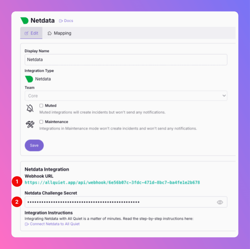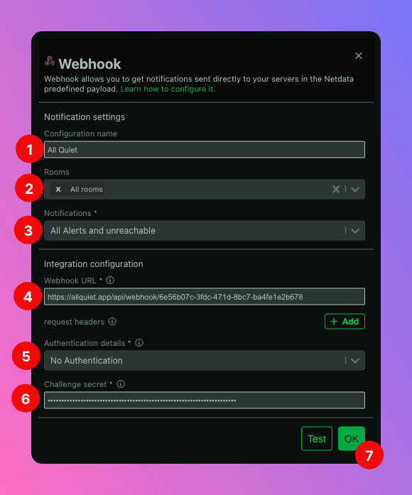 Webhook URL, paste in the All Quiet Webhook URL you’ve obtained in step Webhook URL and Netdata Challenge Secret. - As