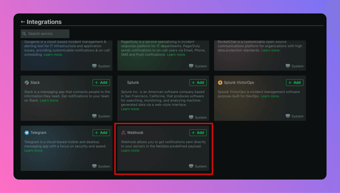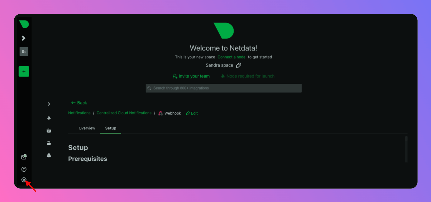 Once you’ve set up an integration of type “Netdata” with All Quiet, the next crucial steps involve configuring your Netdata account. This is essential for ensuring that your monitoring setup can effectively send incidents to the All Quiet webhook. In this part of the guide, we will walk you through the process of linking Netdata with All Quiet via webhook. First, you need to sign in to your Netdata Account and openSettings