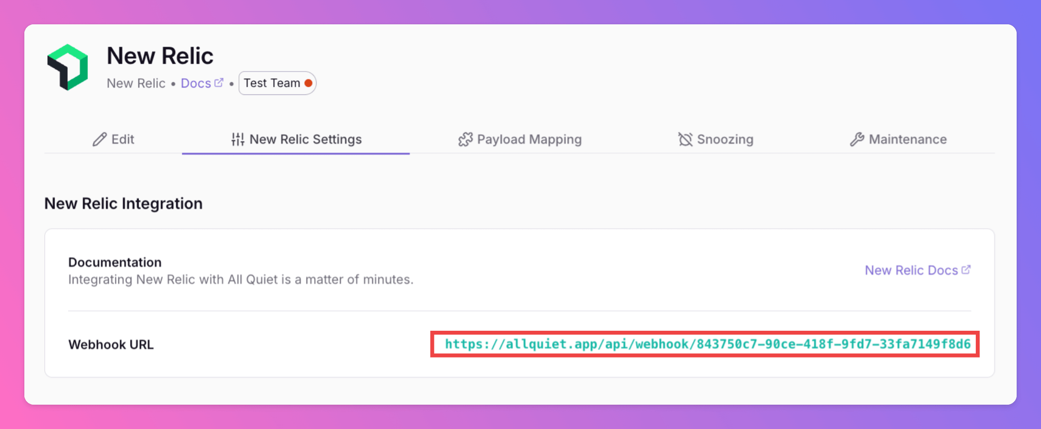 - Create a New Relic integration on the All Quiet platform to obtain a webhook URL.